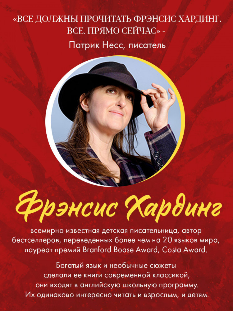 Фрэнсис Хардинг — популярная писательница, автор бестселлеров для детей (12+), подростков и взрослых «Королевство запретных книг», «Девочка с медвежьим сердцем», «Песня кукушки», «Паучий дар» и других приключенческих книг в жанре Young Adult. Богатый язык и необычные сюжеты произведений сделали Хардинг классиком современной зарубежной детской литературы и обладателем множества премий. В каждой книге Хардинг есть мистика и фэнтези, магия и волшебство, страшные сказки и приключения, но в основе всегда обычная жизнь и подростковая психология.