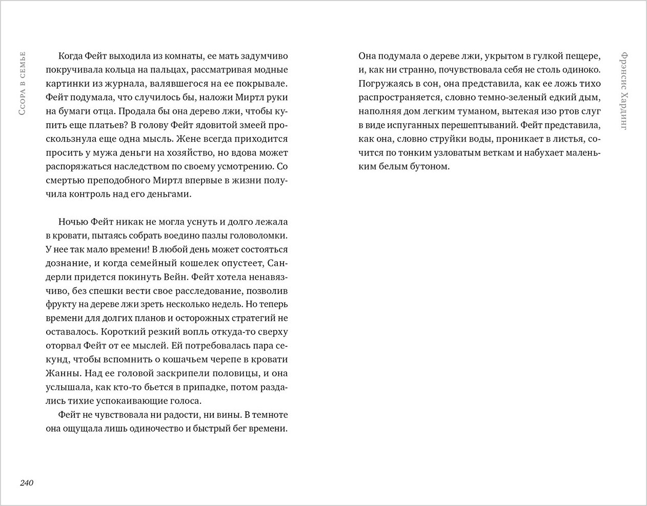 Серия: Волшебные миры Фрэнсис Хардинг «Дерево лжи» — один из самых известных романов автора бестселлеров «Песня кукушки» и «Паучий дар» . Книга — путешествие в прошлое, в противоречивую, чопорную и таинственную Англию времен королевы Виктории. После внезапного переезда семьи из графства Кент на отдаленный остров отец четырнадцатилетней Фейт погибает при загадочных обстоятельствах. В наследство ей достается волшебное дерево. Оно растет и дает плоды, питаясь лживыми историями, нашептанными его листьям. Чем серьезнее ложь, тем крупнее зреет плод. Чем крупнее съеденный плод, тем грандиознее открывается тайна. Пытаясь с помощью магии дерева разобраться, что на самом деле произошло с отцом, Фейт начинает свою игру. Но с каждой историей ей все сложнее отличить, где правда, а где ложь. Как далеко она готова зайти ради цели? Серия «Волшебные миры Фрэнсис Хардинг» — это фэнтези-бестселлеры всемирно известной детской писательницы в новом оформлении! Мистические истории, где главные герои — обычные подростки, которые оказываются в центре невероятных событий и пытаются разгадать секреты по обе стороны реальности.