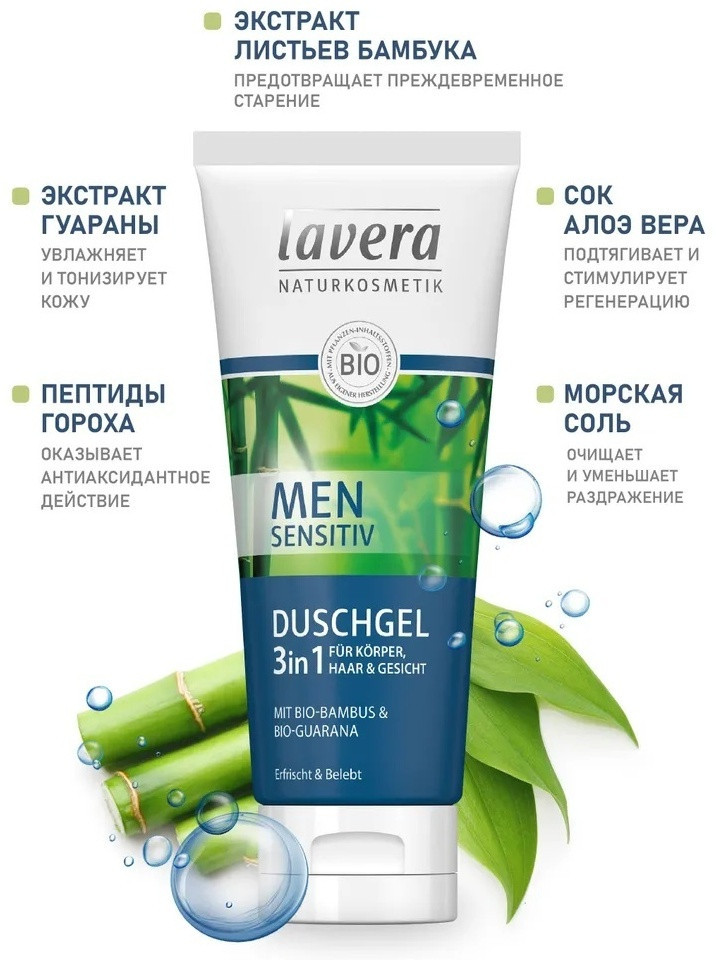 Lavera Гель для душа мужской 3 в 1В данный момент этот товар отсутствует в продаже. Возможно, у нас найдется аналогичный или похожий товар здесь. Деликатный очищающий гель 3 в 1 идеально подходит для ежедневного применения. Нежно очищает, не нарушая естественного гидро-липидного баланса и обеспечивает чувствительную мужскую кожу необходимыми микроэлементами. Экстракты гуараны и бамбука тонизируют кожу и балансируют выработку кожного себума, улучшают микроциркуляцию кожи. |