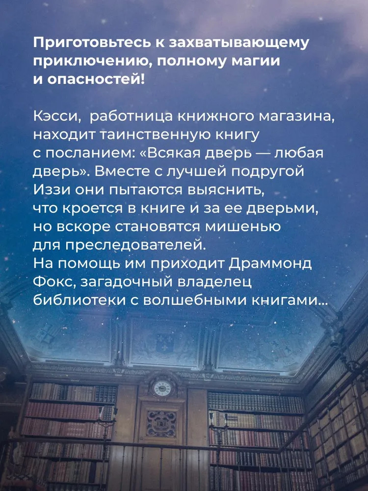 💳 Оплатить за товар можно при получении 🇰🇿 Есть бесплатная доставка по Казахстану от 1 дня 🎁 Копите бонусы с каждой покупки Серия: Тайная комната: немного волшебства В руки Кэсси Эндрюс, обычной сотрудницы книжного магазина, попадает необычная книга с загадочным посланием, которое гласит: "Всякая дверь — любая дверь".Кэсси и ее лучшая подруга Иззи пытаются выяснить, что кроется в волшебной книге и за ее дверьми, но из-за этого на них открывается настоящая охота. На помощь девушкам приходит Драммонд Фокс, таинственный владелец библиотеки с волшебными книгами: только он знает, как спастись от тех, кто готов на все, чтобы заполучить могущественную Книгу дверей... |