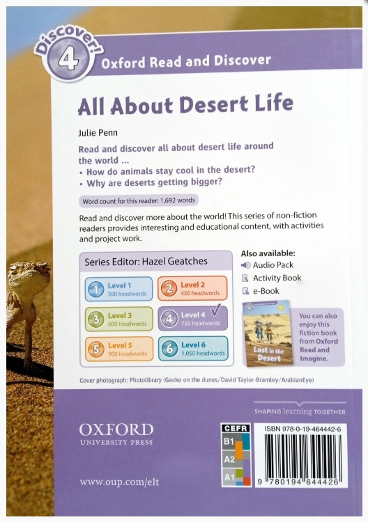 💳 Оплатить за товар можно при получении 🇰🇿 Есть бесплатная доставка по Казахстану от 1 дня 🎁 Копите бонусы с каждой покупки Серия: Oxford Read and Discover Прочитай и узнай всё о жизни в пустыне по всему миру. Как животные сохраняют прохладу в пустыне? Почему пустыни становятся больше? Познавательная серия адаптированных книг для чтения Oxford Read & Discover с дополнительными заданиями и интересными проектами для юных исследователей разработана специально для того, чтобы читатели с любым уровнем английского могли погрузиться в мир «открытий чудных» и научных фактов. Содержание серии разработано в соответствии с предметно-языковой интегрированной методикой CLIL (Content and Language Integrated Learning). |