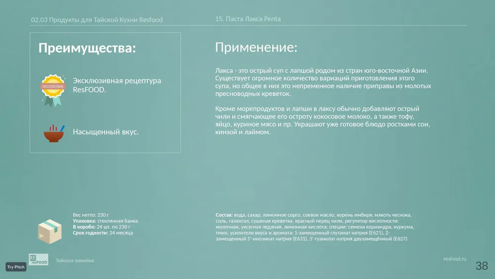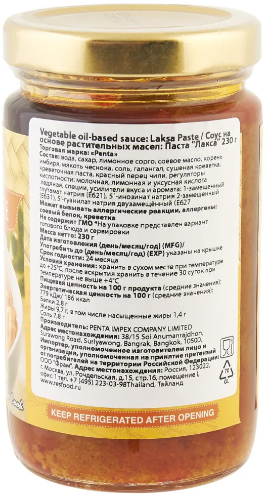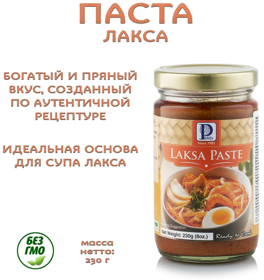 Penta Соус-основа для супа Lakse Paste «Паста Лакса»В данный момент этот товар отсутствует в продаже. Возможно, у нас найдется аналогичный или похожий товар здесь. Идеальная основа для новой классики азиатской кухни — супа лакса! Лакса — это острый суп с лапшой родом из стран юго-восточной Азии. Существует огромное количество вариаций приготовления этого супа, но общее в них это непременное наличие приправы из молотых пресноводных креветок. Кроме морепродуктов и лапши в лаксу обычно добавляют острый чили и смягчающее его остроту кокосовое молоко, а также тофу, яйцо, куриное мясо и пр. Украшают уже готовое блюдо ростками сои, кинзой и лаймом. В составе ароматный лемонграсс, сушеный Чили, лук-шалот, галангал, куркума, сушеные креветки и креветочная паста. Богатый и пряный вкус по аутентичной рецептуре. |