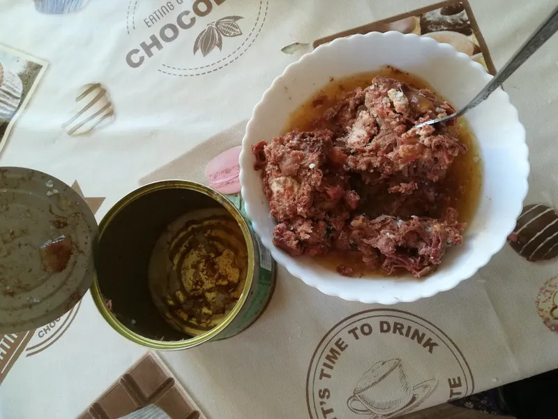 Это не кусковая тушенка , а непонятные слепленные молотые кусочки. Волокон мяса практически нет. После приготовления ( в макароны положила ) оказалось много хрящей. Запаха тушёнки тоже нет.