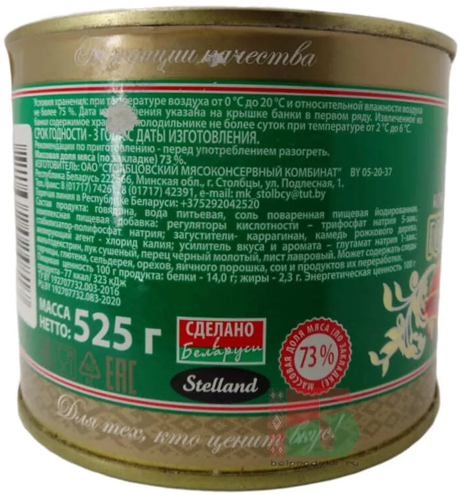 💳 Оплатить за товар можно при получении 🇰🇿 Есть бесплатная доставка по Казахстану от 1 дня 🎁 Копите бонусы с каждой покупки Тушенка из говядины производства ООО «Столбцовский мясоконсервный комбинат» представляет собой консервированный продукт, который готовят на основе свежего отборного мяса и небольшого количества других ингредиентов. Это идеальный продукт для быстрого приготовления супов или вторых блюд. Говядина тушеная белорусская является незаменимым продуктом как для дома, так и для походов, путешествий, рыбалки, дачи. Мясные консервы первого сорта имеют длительный срок годности — 3 года, что очень удобно, при этом говядина тушенка не теряет своих прекрасных вкусовых качеств. |