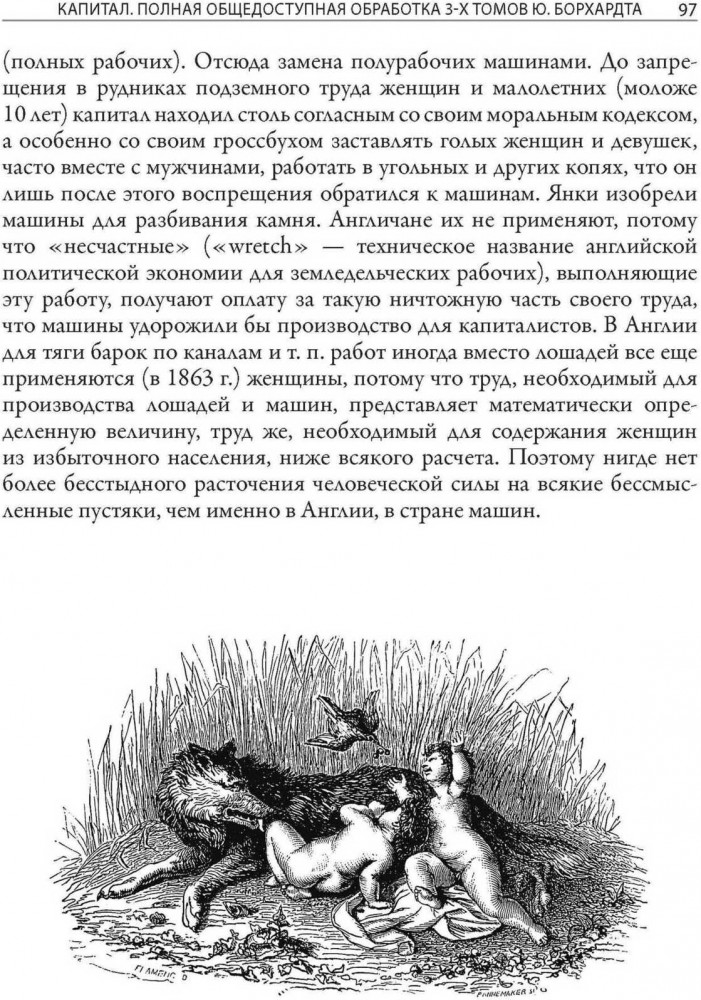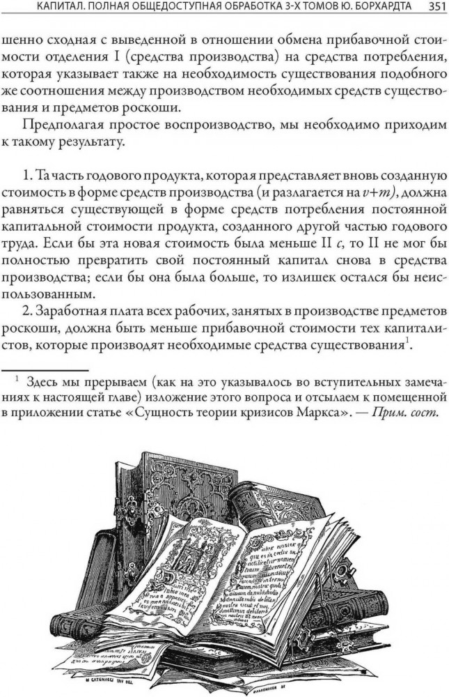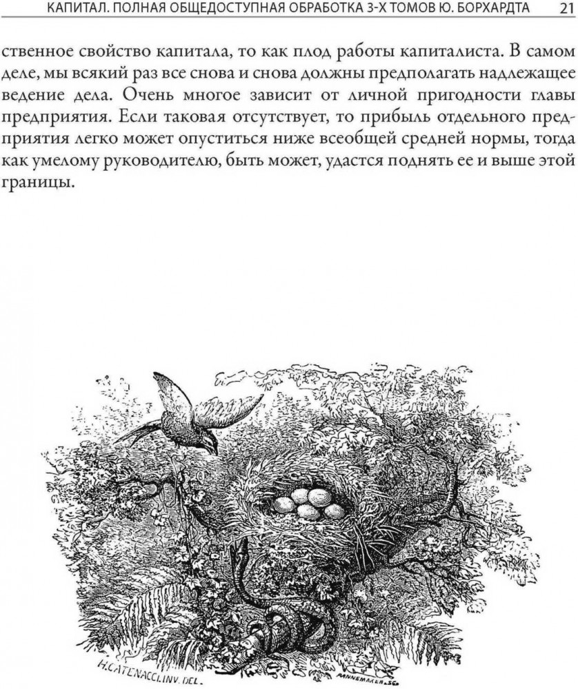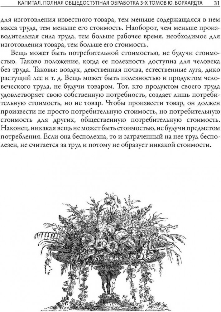 Таким человеком в Германии стал живший на рубеже XIX и ХХ веков политик и журналист Юлиан Борхардт. В юности он познакомился с работой денег не по книжкам — после школы несколько лет занимался торговлей в Берлине. Позже Юлиан стал блестящим преподавателем экономики и одним из основателей Союза пролетарских революционных писателей. Борхардт прекрасно сознавал и ценность труда Маркса, и необходимость его адаптации для широких слоев населения. Писательский талант, преподавательские способности и собственный жизненный опыт позволили ему сжать три тома «Капитала» до объема отдельной книги, не потеряв при этом ни одной мысли самого Маркса. Книга Борхардта впервые была издана в Германии в 1920 году и за одиннадцать последующих лет выдержала семь переизданий, доказав свою значимость и востребованность. Не потеряла она своей актуальности и в наши дни. В предисловии к своему труду Борхардт подчеркивает, что «Капитал» Маркса не излагает абсолютно законченное и неизменное учение. Вместе с тем, без изучения приведенных в «Капитале» основ невозможно полноценно осваивать и оценивать современные экономические теории. Данная книга, украшенная иллюстрациями из первого французского издания «Капитала», дает прекрасную возможность познакомиться с этими основами. |
