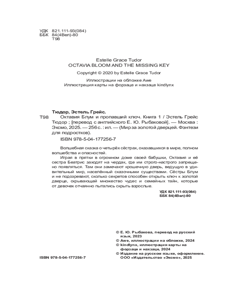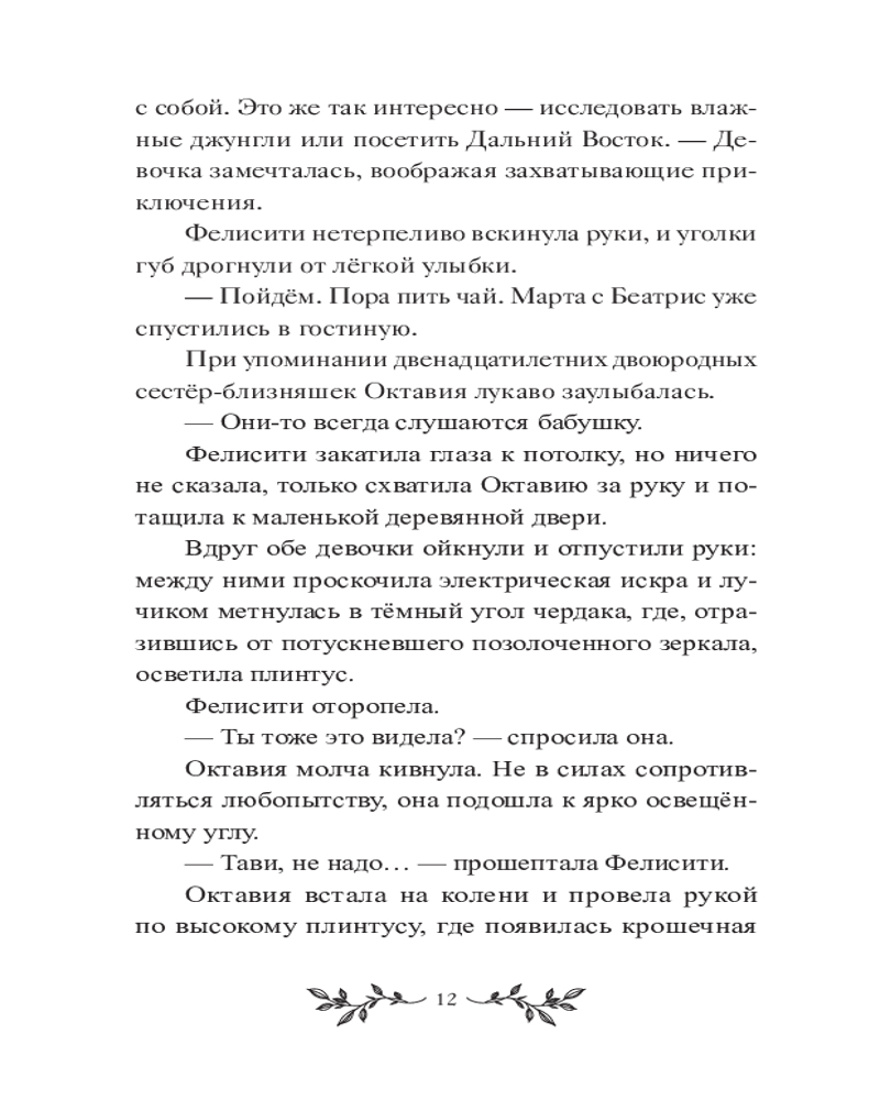 💳 Оплатить за товар можно при получении 🇰🇿 Есть бесплатная доставка по Казахстану от 1 дня 🎁 Копите бонусы с каждой покупки Серия: Мир за золотой дверцей. Фэнтези для подростков Октавии почти 10 лет, и она жаждет веселья и приключений. Она проводит каникулы в доме у бабушки, играя с сестрой Фелисити и кузинами Беатрис и Мартой. Однажды во время пряток девочка решает спрятаться на чердаке. Её находит Фелисити и призывает спуститься вниз, ведь бабушка запретила им там находиться. Они уже собираются уходить, когда замечают маленькую дверь. По другую сторону девочек Блум ждут могущественные феи, дружелюбные единороги и говорящие животные. Но сначала нужно найти ключ... |