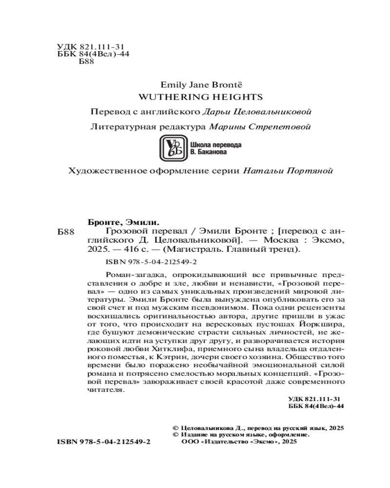💳 Оплатить за товар можно при получении 🇰🇿 Есть бесплатная доставка по Казахстану от 1 дня 🎁 Копите бонусы с каждой покупки Серия: Магистраль. Главный тренд История трагической любви двух диких сердец — одно из самых популярных и узнаваемых произведений в европейской литературе XIX века. «Грозовой перевал» был неоднократно экранизирован, а отсылки к сюжету можно найти во многих произведениях о разрушительной страсти. Любовь на фоне мрачных вересковых пустошей привела к помешательству и смерти героев единственного романа Эмили Бронте. Ярость, бунт и привязанность слились в единое целое в жизни Хитклиффа и Кэтрин. Чувства диковатого приемыша к сводной сестре не смиряются ни перед логикой, ни перед моралью, над ними не властны ни человеческая сила, ни злой рок, ни даже смерть. |