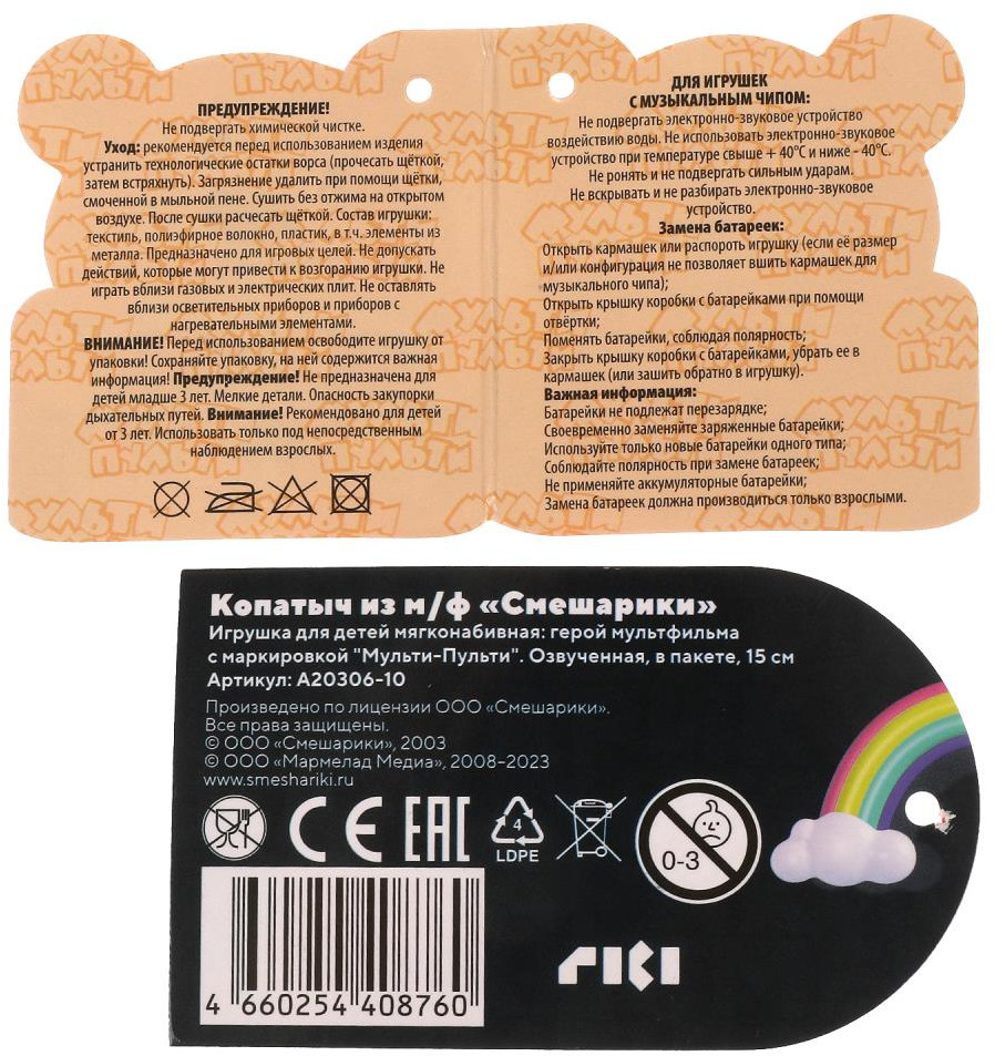 💳 Оплатить за товар можно при получении 🇰🇿 Есть бесплатная доставка по Казахстану от 1 дня 🎁 Копите бонусы с каждой покупки Серия: Смешарики Малыш будет рад знакомству с мягким Копатычем, который выглядит в точности как персонаж мультфильма. С такой милой, приятной на ощупь игрушкой ребёнок может воссоздать уже знакомые по мультсериалу сюжеты или придумать новые. При нажатии на музыкальную кнопку игрушка будет воспроизводить весёлую песенку. |
