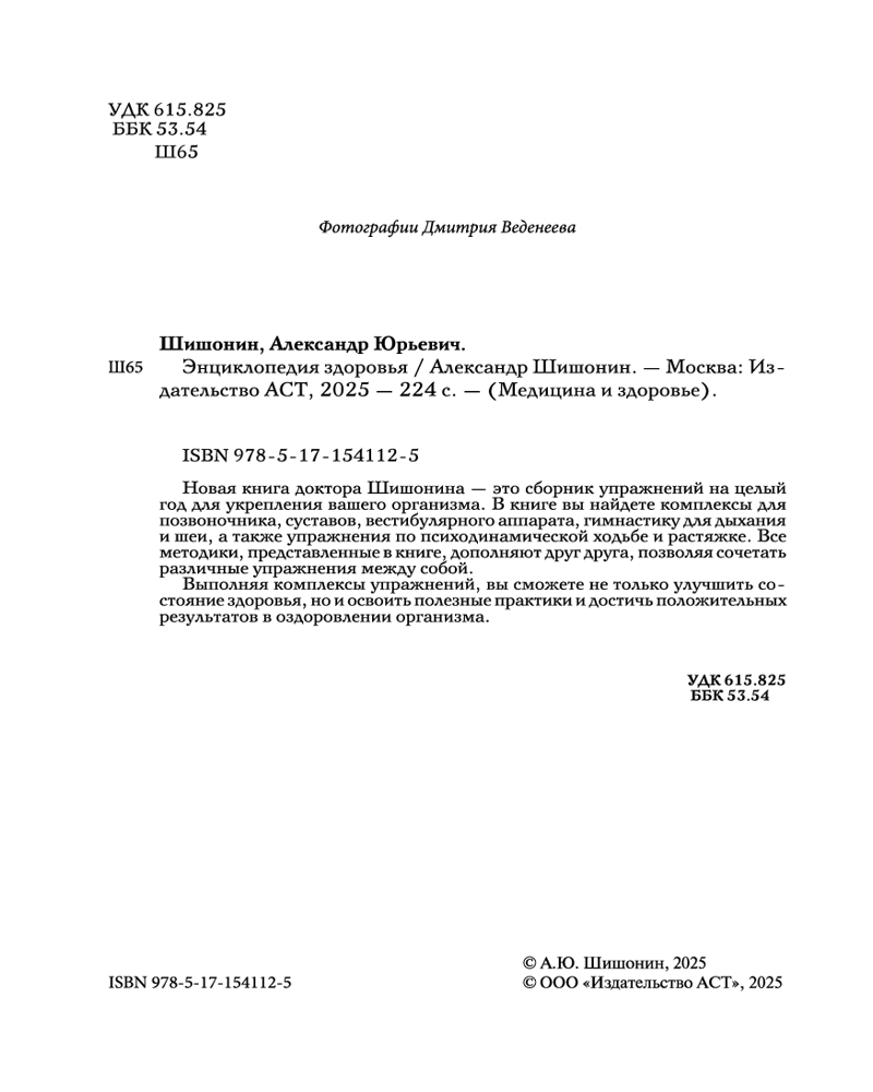 💳 Оплатить за товар можно при получении 🇰🇿 Есть бесплатная доставка по Казахстану от 1 дня 🎁 Копите бонусы с каждой покупки Серия: Медицина и здоровье Новая книга доктора Шишонина — это сборник упражнений на целый год для укрепления вашего организма. В книге вы найдете комплексы для позвоночника, суставов, вестибулярного аппарата, гимнастику для дыхания и шеи, а также упражнения по психодинамической ходьбе и растяжке. Все методики, представленные в книге, дополняют друг друга, позволяя сочетать различные упражнения между собой. Выполняя комплексы упражнений, вы сможете не только улучшить состояние здоровья, но и освоить полезные практики и достичь положительных результатов в оздоровлении организма. Также внутри книги вас ждут ссылки на эксклюзивные видеоматериалы, в которых Александр Шишонин научит технике психодинамической ходьбы. |