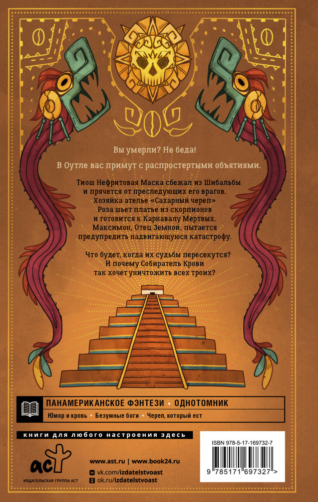 💳 Оплатить за товар можно при получении 🇰🇿 Есть бесплатная доставка по Казахстану от 1 дня 🎁 Копите бонусы с каждой покупки Серия: Страшные сказки со всего света. Ретеллинги Вы умерли? Не беда! В Оутле вас примут с распростертыми объятиями. Тиош Нефритовая Маска сбежал из Шибальбы и прячется от преследующих его врагов. Хозяйка ателье «Сахарный череп» Роза шьет платье из скорпионов и готовится к Карнавалу Мертвых. Максимон, Отец Земной, пытается предупредить надвигающуюся катастрофу. Что будет, когда их судьбы пересекутся? И почему Собиратель Крови так хочет уничтожить всех троих? |