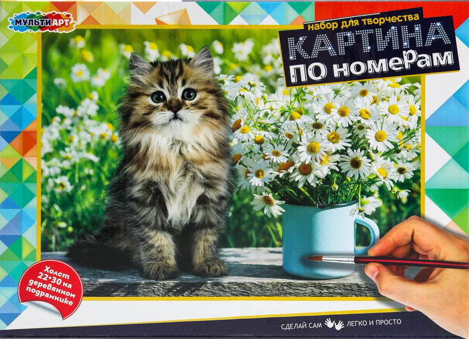 Картина по номерам «Котик с цветами» ТМ «Мульти Арт» — отличный подарок для маленького художника. Ребёнок увлекательно и с пользой проведёт время, расписывая холст с нанесённой основой и цветовыми подсказками. Готовую картину можно использовать для украшения комнаты или в качестве подарка, сделанного своими руками.