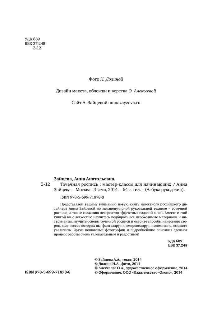 Точечная роспись: мастер-классы для начинающихВ данный момент этот товар отсутствует в продаже. Возможно, у нас найдется аналогичный или похожий товар здесь. Серия: Азбука рукоделия Представляем вашему вниманию новую книгу известного российского дизайнера Анны Зайцевой по мегапопулярной рукодельной технике - точечной росписи, а также созданию невероятно эффектных изделий в ней. Вместе с этой книгой вы с легкостью научитесь подбирать все необходимые материалы и инструменты, изучите основы точечной росписи и освоите способы нанесения узоров, количество которых вы, фантазируя и импровизируя, несомненно, сможете увеличить. Яркие пошаговые фотографии и подробнейшие описания сделают процесс работы очень увлекательным и радостным! |