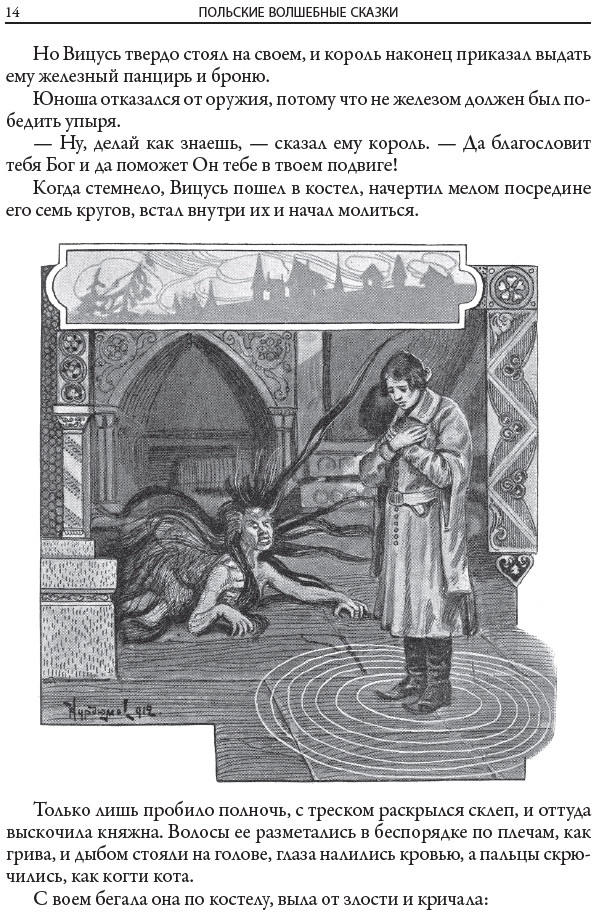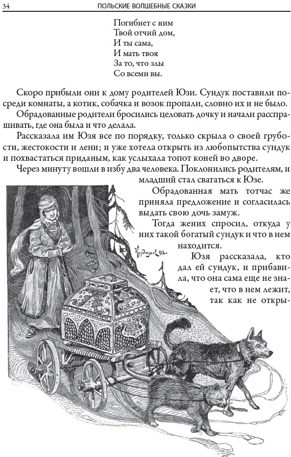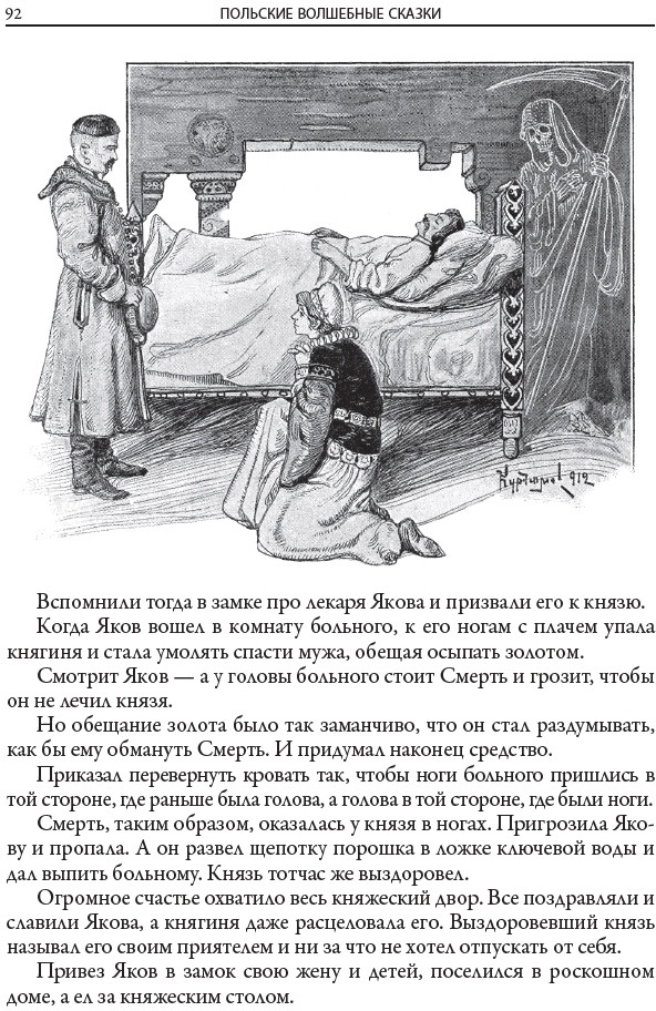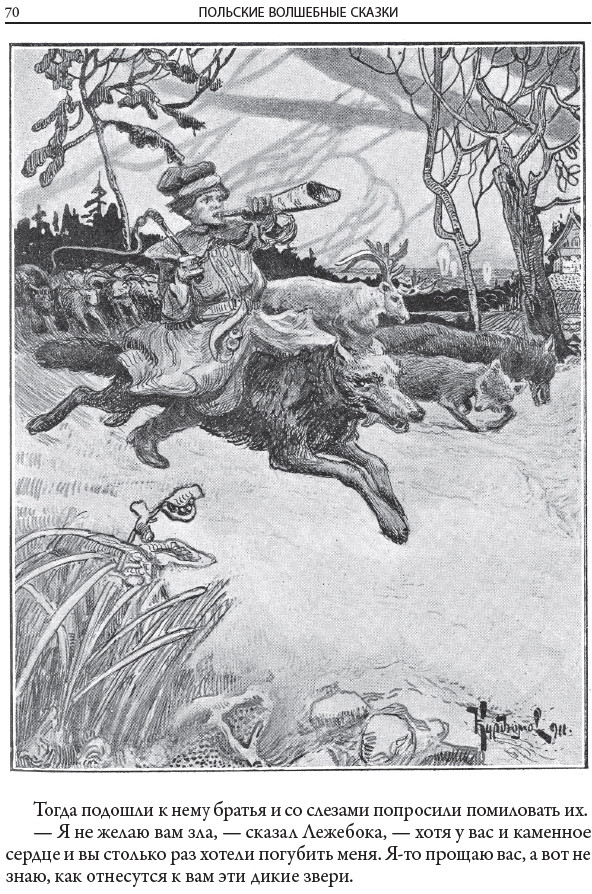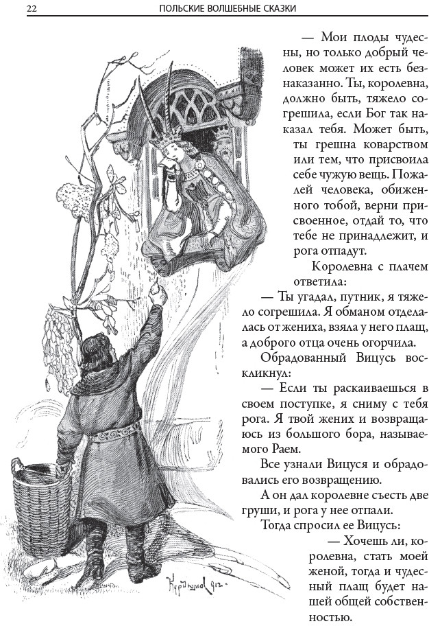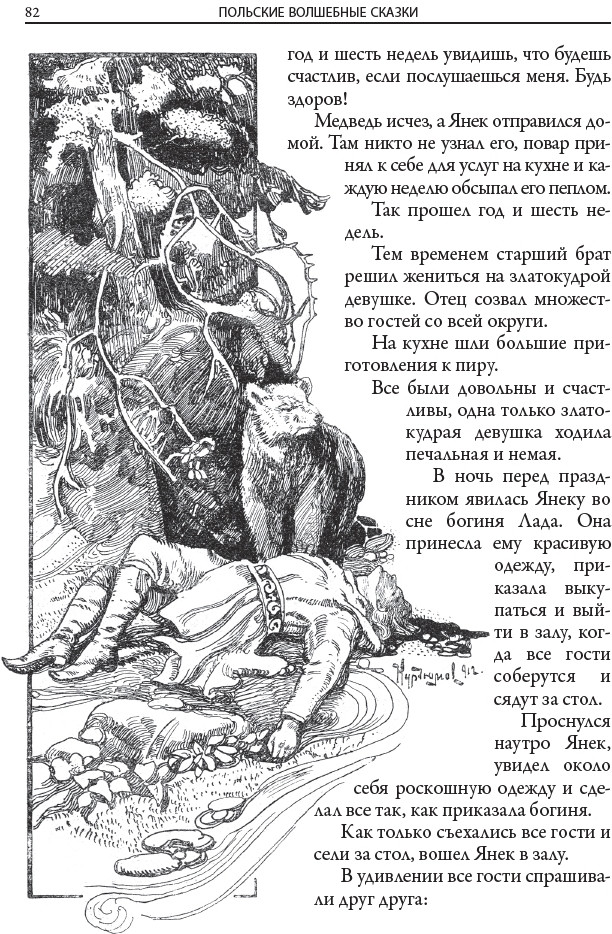 Восемнадцать польских сказок, составивших эту книгу, были впервые напечатаны знаменитым московским издателем Иваном Дмитриевичем Сытиным в 1914 году. Он сделал фантастическую карьеру от подручного в книжной лавке до видного книгоиздателя и владельца крупной сети книжных магазинов и лавок. Иван Дмитриевич старался сделать книги недорогими и привлекательными для читателей. Для этого он привлекал к оформлению своей продукции лучших художников России. С Сытиным сотрудничали такие мэтры живописи, как Илья Ефимович Репин и Иван Яковлевич Билибин. Для иллюстрирования сборника польских сказок Сытин привлек к работе талантливого художника Валерия Николаевича Курдюмова. Его рисунки украшают и это современное издание. Достаточно взглянуть на любую его иллюстрацию, чтобы сразу понять — это работа подлинного мастера. Курдюмов прекрасно владел композицией и техникой штрихового рисунка. С помощью тонких линий он прекрасно передавал мех медведя, складки одежды или игру света и тени на камнях в лесной чаще. В его манере чувствуется влияние и уникального билибинского стили, и модных художественных веяний начала ХХ века. Любопытно отметить, что Курдюмов был основателем знаменитого московского дома-коммуны в Лефортове, где проживали и занимались живописью многие художники самых различных направлений. В 1905 году там поселили Казимир Малевич, которого связывали с Курдюмовым теплые дружеские отношения. К сожалению, в истории сохранилось мало сведений о жизни В. Н. Курдюмова; лучшим памятником художника остаются его неподвластные времени рисунки. |
