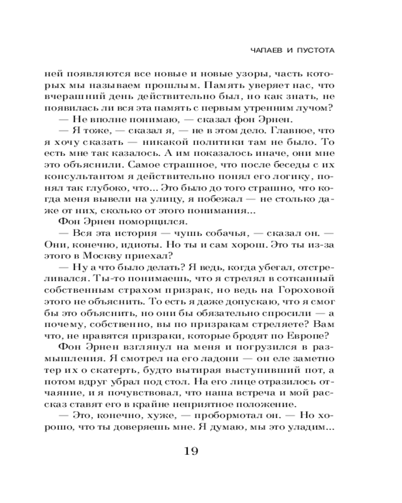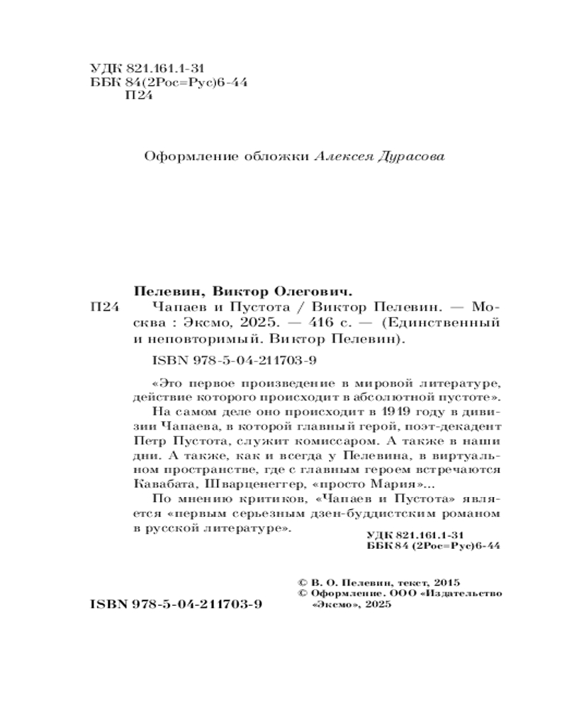💳 Оплатить за товар можно при получении 🇰🇿 Есть бесплатная доставка по Казахстану от 1 дня 🎁 Копите бонусы с каждой покупки Серия: Единственный и неповторимый. Виктор Пелевин (обложка) Роман «Чапаев и Пустота» сам автор характеризует так: «Это первое произведение в мировой литературе, действие которого происходит в абсолютной пустоте». На самом деле оно происходит в 1919 году в дивизии Чапаева, в которой главный герой, поэт-декадент Петр Пустота, служит комиссаром. А также в наши дни. А также, как и всегда у Пелевина, в виртуальном пространстве, где с главным героем встречаются Кавабата, Шварценеггер, «просто Мария»... По мнению критиков, «Чапаев и Пустота» является «первым серьезным дзен-буддистским романом в русской литературе». |
