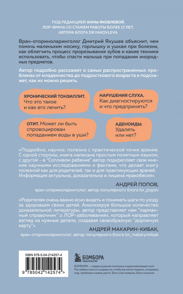 💳 Оплатить за товар можно при получении 🇰🇿 Есть бесплатная доставка по Казахстану от 1 дня 🎁 Копите бонусы с каждой покупки Серия: Чтобы дети не болели. Книги от известных врачей-блогеров Когда больное горло лечат холодным? Есть ли связь между употреблением молока и обилием соплей у ребенка? Чем полезна техника «материнского поцелуя»? О чём говорит цвет соплей? На эти и многие другие вопросы ответит опытный врач-отоларинголог Дмитрий Якушев, создатель сообщества ЛОРов, где делятся своим опытом более 400 врачей, а также автор блога ent_speech с аудиторией более 18 000 подписчиков. |