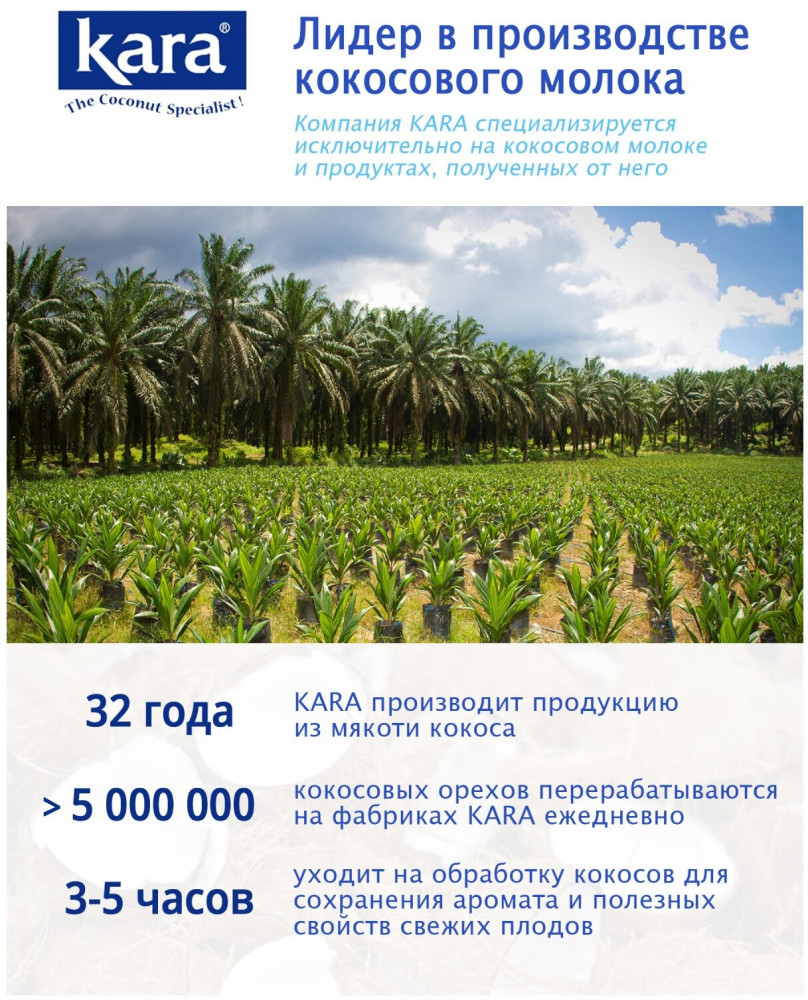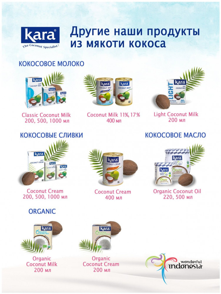 Kara Сливки кокосовые 24% «UHT Coconut Cream»В данный момент этот товар отсутствует в продаже. Возможно, у нас найдется аналогичный или похожий товар здесь. Kara — настоящий вкус кокоса. Kara — лидер по производству продуктов из кокосов. Все орехи выращиваются и собираются вручную на собственных плантациях компании на индонезийском острове Суматра. После этого кокосы доставляются на завод, где обрабатываются в считанные часы для того, чтобы сохранить максимальное количество полезных свойств и создать продукт высшего качества. Кокосовые сливки Kara отлично взбиваются, являются основой для кремов, десертов и различных блюд азиатской кухни, карри, супов, соусов, горячих и холодных напитков. Используются как альтернатива коровьим сливкам. |