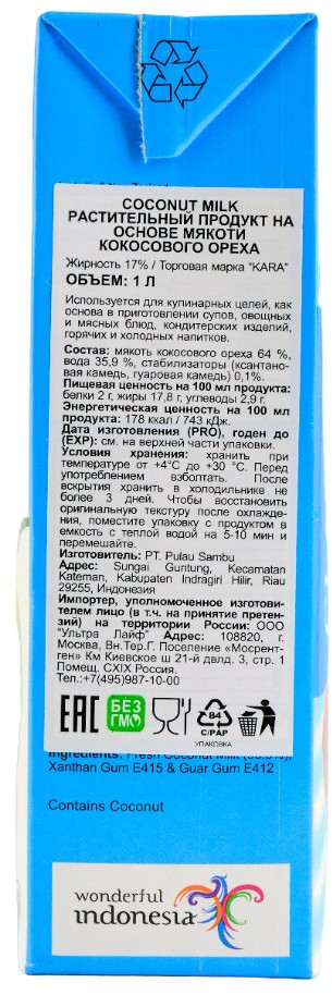 Kara Молоко кокосовое 17% «UHT Coconut Milk»