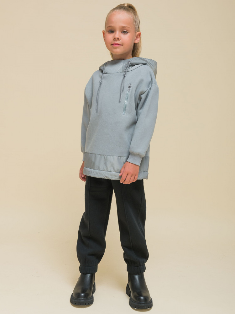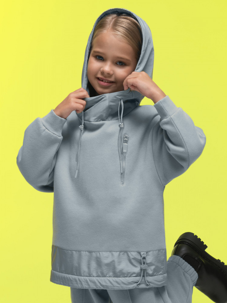 Худи детское для девочки. Толстовка выполнена в сочетании двух материалов: футера с начёсом и гладкой курточной ткани. Это супермодный тренд. Капюшон и отделка по низу изделия из курточной ткани — максимум практичности. Ребёнок не промокнет, а декоративная притачная полоса не будет мараться при частой носке. Худи для девочек актуального оверсайз-силуэта со спущенным плечом подарит ребёнку комфорт и свободу движения. Высокий воротник защищает шею от холода и ветра. По низу рукавов манжеты из эластичной рибаны (ткань в рубчик), они не растягиваются и сохраняют форму и прекрасный внешний вид надолго. Слева на груди прорезной карман на молнии — удобно спрятать телефон. Капюшон с двумя швами, что обеспечивает анатомически правильную форму и комфортную посадку по голове. Объём капюшона регулируется тесьмой. Двойной капюшон — швы закрыты, смотрится аккуратно. По низу модели кулиска для регулировки объёма эластичным шнуром, фиксатор шнура расположен слева.