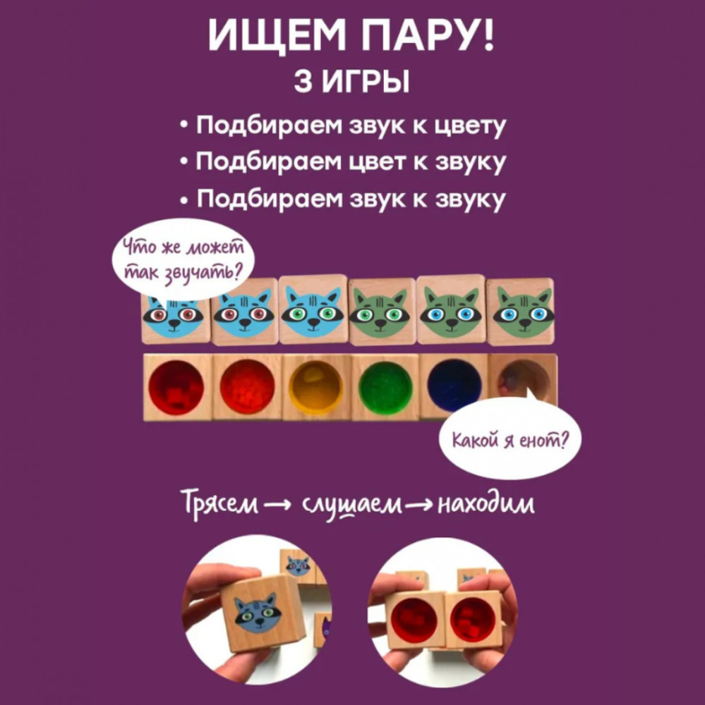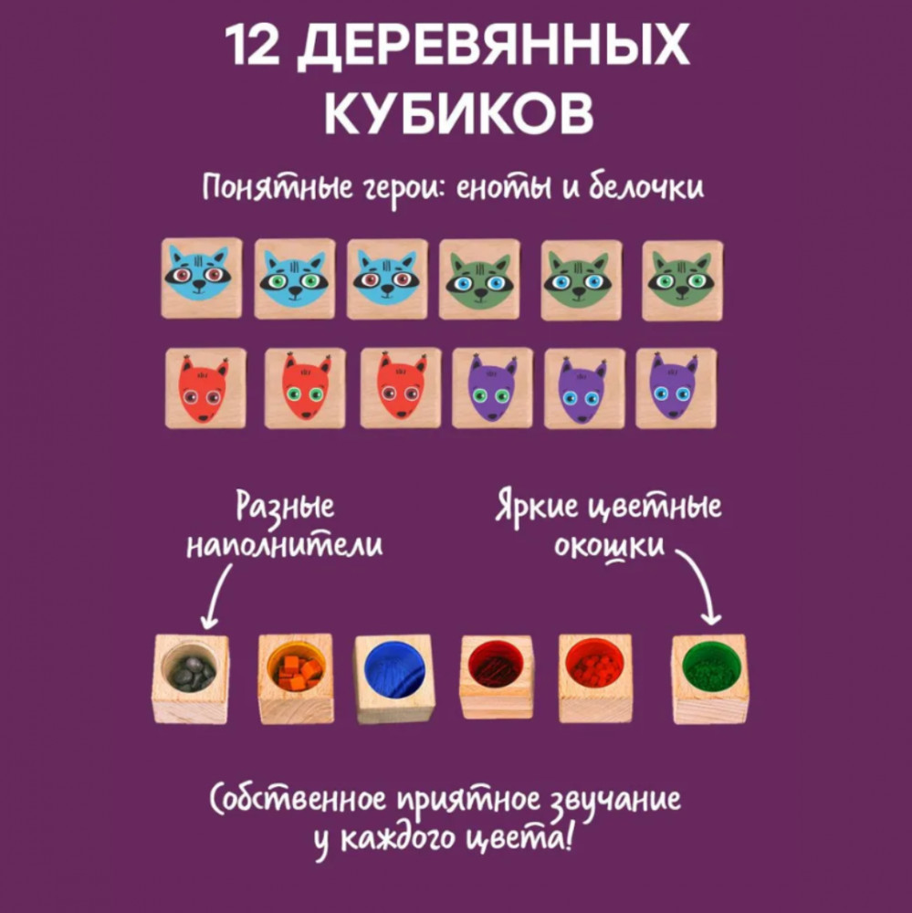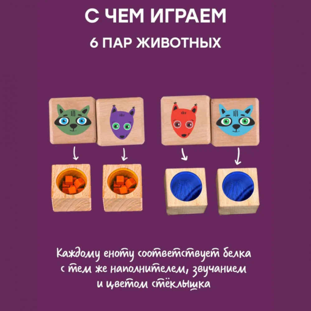 Для примера разберём самую простую, но тем не менее интересную и важную игру для начинающих. Что мы делаем? По звуку ищем цвет. Разделите кубики на 2 кучки: белки и еноты (можно взять сначала не все шесть пар, а меньшее количество: три или четыре). Белок положите цветными кружочками вверх, енотов — кружочками вниз. Один игрок гремит кубиком с енотом (греметь — это значит, трясти, извлекая звук из кубика, но не переворачивая его, чтобы не было видно низа: там наполнитель и цветной акриловый кружочек), второй — находит пару с тем же звуком по цветным кружочкам, определяя только по виду наполнителя, какой из них может так звучать. Как только получилось определить правильно (стремимся с первого раза), второй игрок забирает себе пару кубиков в качестве победной пары. Далее первый игрок гремит следующим енотом. И так далее, пока все кубики не закончатся. Затем поменяйтесь ролями и сыграйте ещё раз. Далее идут усложнения, включая составное поле, где мы играем в увлекательную игру, отдалённо напоминающую шахматы.
