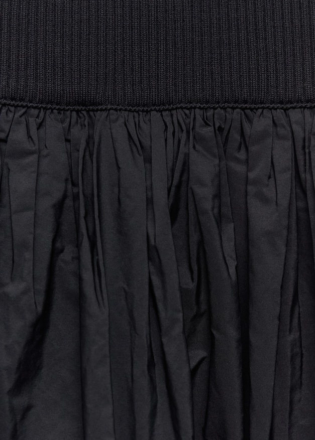 Стильная мини-юбка фонариком. Короткий фасон. Защипы для придания объема. Фасон «колокол». Эластичный пояс. Края связаны резинкой. Без застежки.