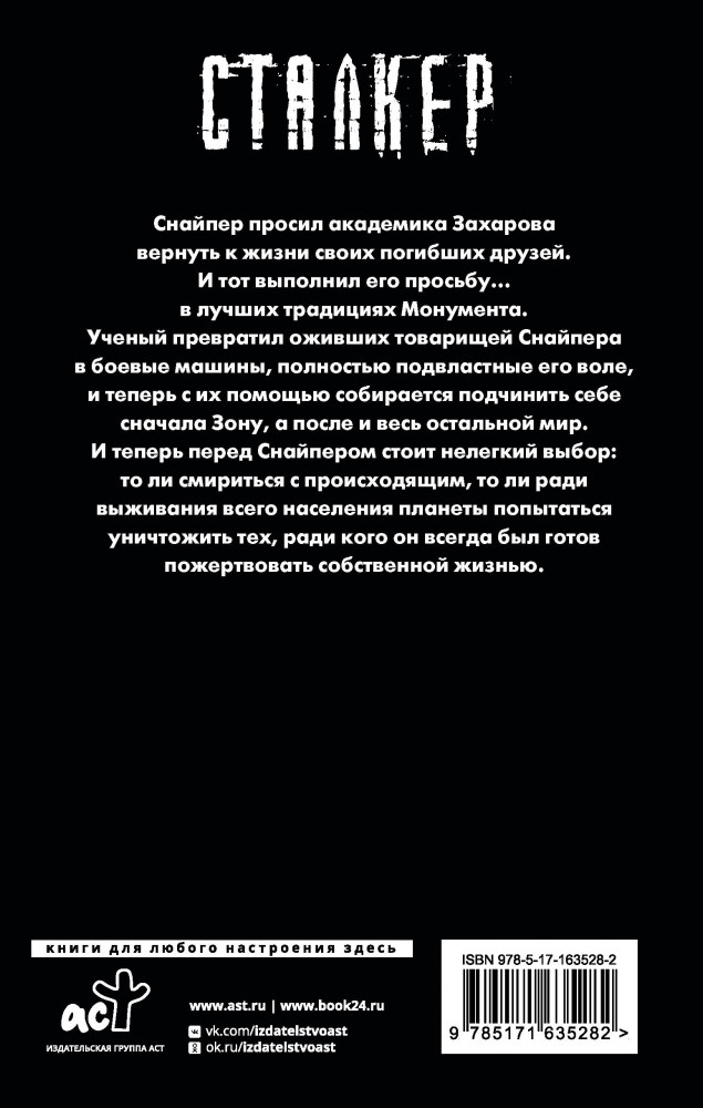 💳 Оплатить за товар можно при получении 🇰🇿 Есть бесплатная доставка по Казахстану от 1 дня 🎁 Копите бонусы с каждой покупки Серия: Сталкер Снайпер просил академика Захарова вернуть к жизни своих погибших друзей. И тот выполнил его просьбу... в лучших традициях «Монумента». Учёный превратил оживших товарищей Снайпера в боевые машины, полностью подвластные его воле, и теперь с их помощью собирается подчинить себе сначала Зону, а после и весь остальной мир. И теперь перед Снайпером стоит нелёгкий выбор: то ли смириться с происходящим, то ли ради выживания всего населения планеты попытаться уничтожить тех, ради кого он всегда был готов пожертвовать собственной жизнью. |
