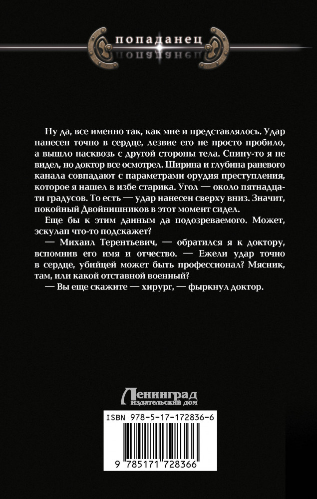 Господин следовательоформление читается быстро стиль юмор В данный момент этот товар отсутствует в продаже. Возможно, у нас найдется аналогичный или похожий товар здесь. Серия: Попаданец Кажется, всё в жизни складывается удачно. Молод, достаточно успешен. Никак не бизнесмен, а ученый, зато научная карьера складывается успешно. Кандидат наук в тридцать лет, в перспективе — доцент, а там и защита докторской не за горами. Квартирный вопрос решен. Занимаешься любимым делом, рядом с тобой женщина, которая скоро станет твоей женой. И жизнь распланирована на несколько лет вперед. Но кто же мог ожидать, что поездка с будущей тещей на дачу закончится ДТП и реанимацией? И никому бы в страшном сне не приснилось, что ДТП двадцать первого века окажется связано с «крушением» кареты, в которой ехал сынок вице-губернатора, — студент Императорского университета. Вот и не верь после этого в реинкарнацию! |