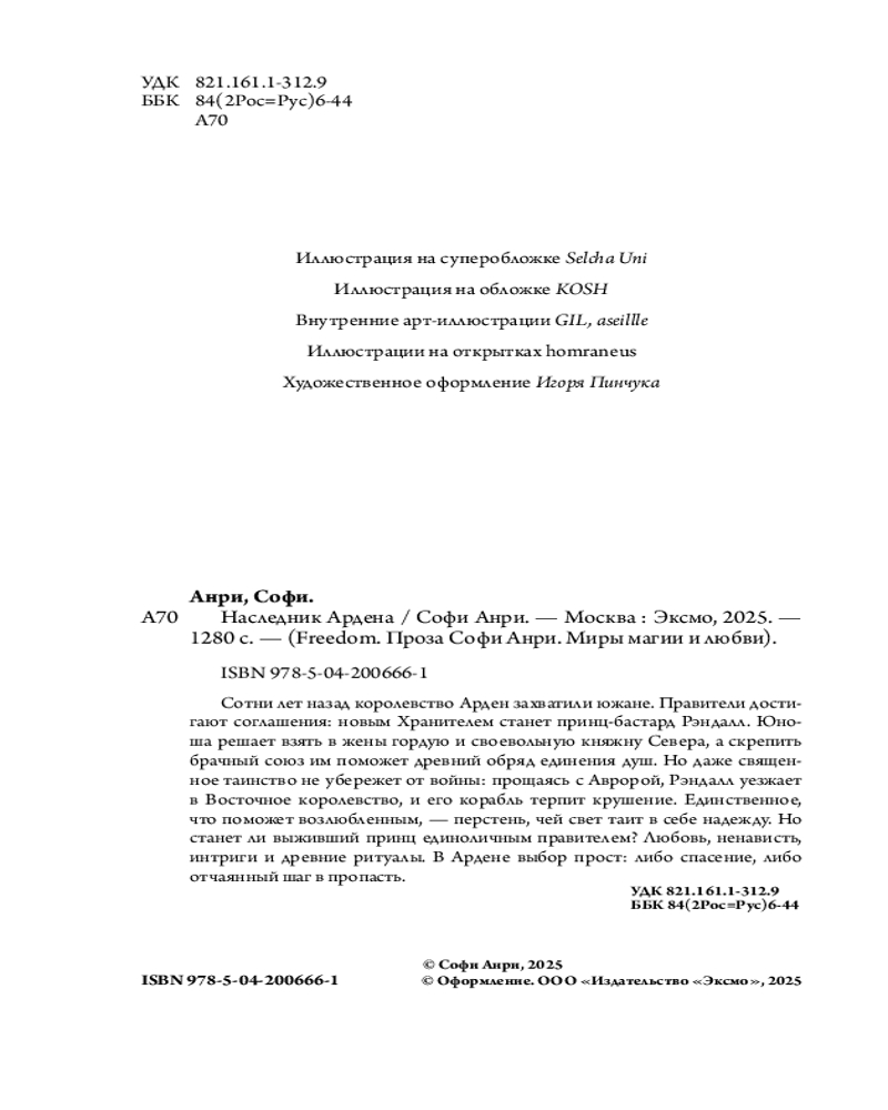💳 Оплатить за товар можно при получении 🇰🇿 Есть бесплатная доставка по Казахстану от 1 дня 🎁 Копите бонусы с каждой покупки Серия: Freedom. Проза Софи Анри. Миры магии и любви Невероятная фэнтези-трилогия от Софи Анри — писательницы, ставшей лауреатом премии «Эксмо. Дебют» за роман «Принц Ардена»! Теперь в формате коллекционного иллюстрированного омнибуса — три истории в одном томе. Дворцовые интриги, чувства hate-to-love, войны, фамильные тайны и древние легенды. |