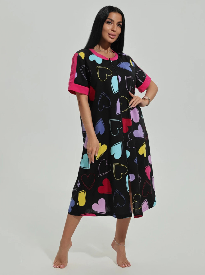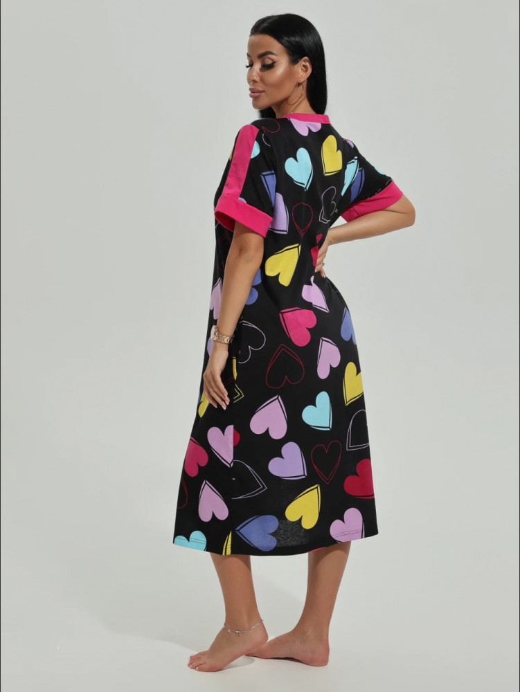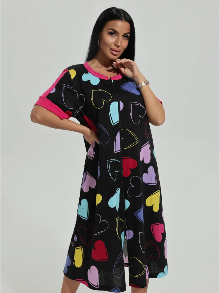 Приятная расцветка, веселенькая, нарядная. Крой А-образный, поэтому садишься и не переживаешь, что вырвется замок снизу. На черном фоне сердечки разнообразных расцветок, на плечах и руковах отделано тканью малинового цвета. 100% хлопок, приятный к телу