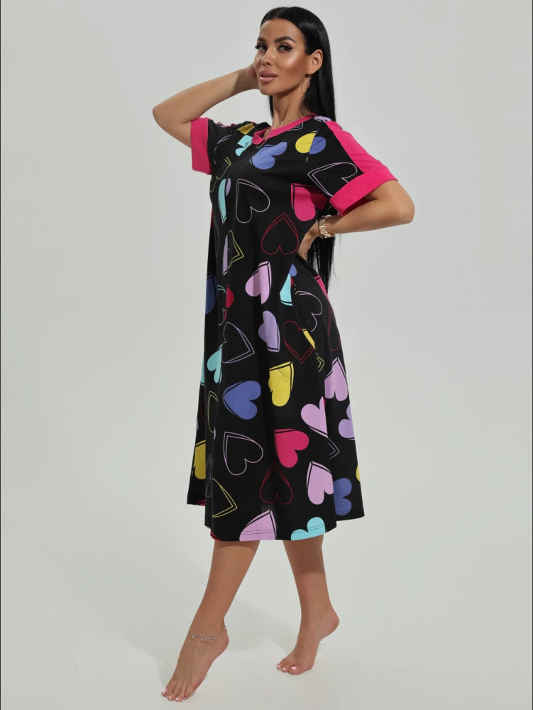 Приятная расцветка, веселенькая, нарядная. Крой А-образный, поэтому садишься и не переживаешь, что вырвется замок снизу. На черном фоне сердечки разнообразных расцветок, на плечах и руковах отделано тканью малинового цвета. 100% хлопок, приятный к телу