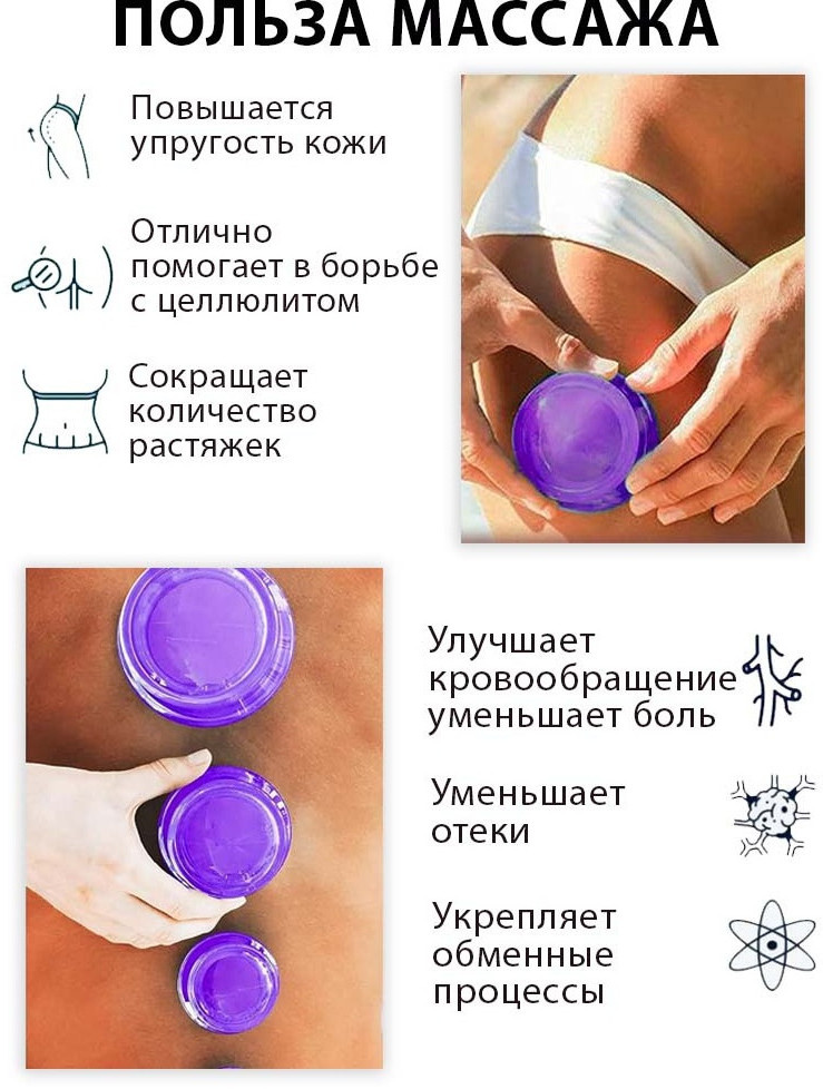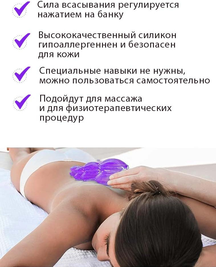💳 Оплатить за товар можно при получении 🇰🇿 Есть бесплатная доставка по Казахстану 🎁 Копите бонусы с каждой покупки Банки массажные силиконовые для проведения вакуумного массажа. Используются для проведения антицеллюлитного, общеукрепляющего массажа различных частей тела. Принцип действия: создание вакуума происходит в результате сжатия банки рукой создается отрицательное давление внутри банки и обеспечивается присасывание ее к поверхности кожи. Преимущества: повышают тонус и эластичность мышц, усиливают кровообращение, способствуют устранению капиллярных застоев, борются с целлюлитом. Банки изготовлены из силикона. |