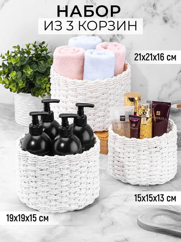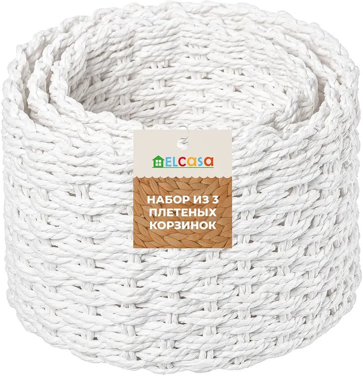 Набор 3 плетёных корзинок ELCASA подойдет для размещения в прихожей, спальне или другой комнате. Имеют прочные стенки и дно. Дизайн в виде плетёнки придает круглым корзинам элегантный вид, что делает их привлекательным элементом декора для вашего интерьера. В такие корзинки можно убрать провода от зарядных устройств, наушники, заколки и резинки для волос, создав порядок на столе. Различие органайзеров по размеру позволяет разделить аксессуары на категории и облегчить их поиск. Контейнеры помогут держать все на своих местах и создать уют в любой комнате. Разместите органайзер на полке в шкафу и храните любые мелочи, например, очки. В гардеробной подойдёт для создания дополнительных секций для ремней, платков или перчаток. В прихожей можно хранить ключи, канцелярию и визитки, избавив пространство от визуального шума. Подходят для оформления декоративных композиций из искусственных цветов. Универсальные ящички станут незаменимыми помощниками для хранения косметики, украшений и бижутерии каждой женщины. Сложите в ёмкости расчески, принадлежности для маникюра или лекарства, чтобы ничего не потерять! На кухне будет удобно складывать в интерьерный ящик упаковки с чаем или пакеты с конфетами и сладостями. Не применять абразивные моющие средства. При использовании в ванной комнате беречь от прямого контакта с водой! Подарите органайзеры на любой праздник маме или бабушке, чтобы они смогли разместить в одном месте предметы для рукоделия, шитья и вязания. В коллекции нашего бренда представлено много функциональных товаров для дома. Комплект из трех плетёных корзин — это практичное и эстетически приятное решение для организации хранения ваших вещей в квартире и на даче. Доступ к любым мелочам станет простым и удобным!