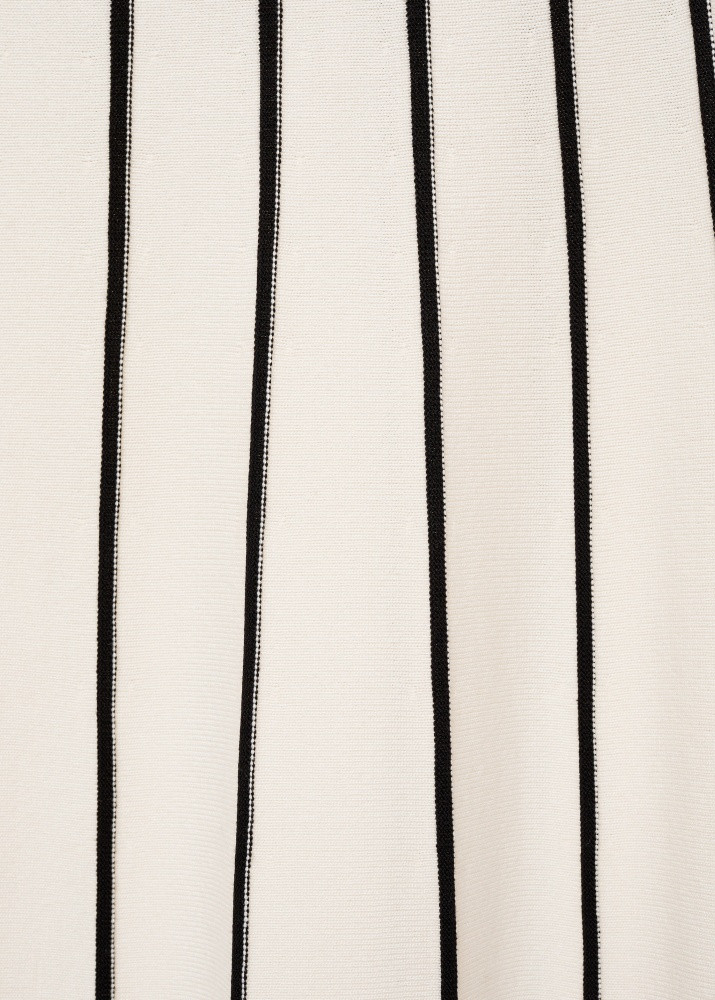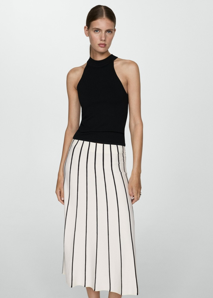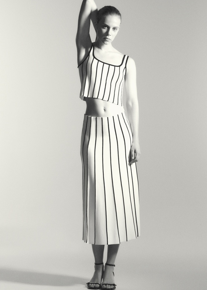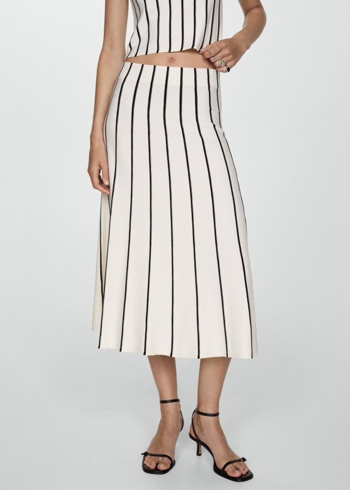 Тонкий трикотаж. Дизайн миди. Прямой фасон. Эластичная талия. Без застежки. Тотальный образ. Узор в полоску.