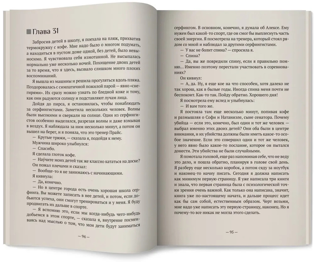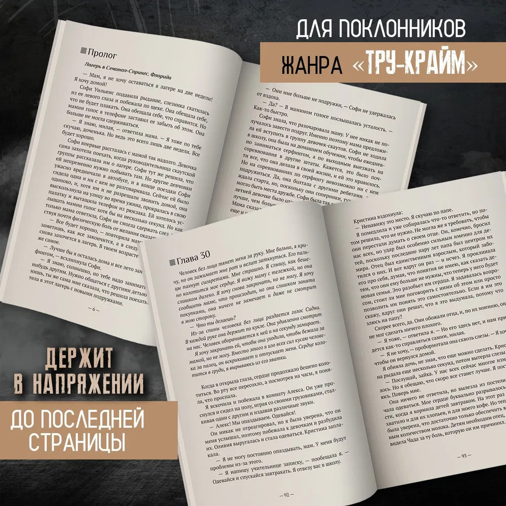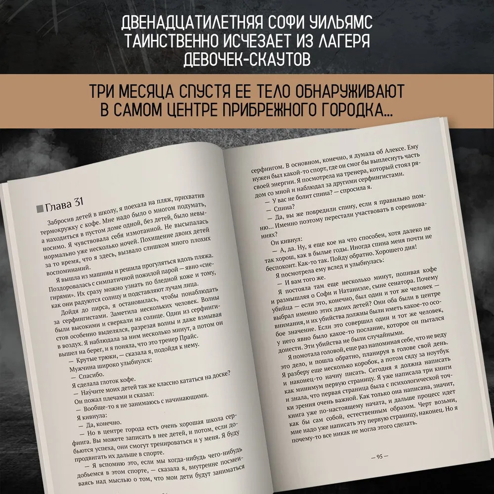 Серия: Профайлер Двенадцатилетняя Софи Уильямс таинственно исчезает из лагеря девочек-скаутов. Три месяца спустя ее тело обнаруживают в самом центре прибрежного городка Коко-Бич в штате Флорида. Жители города потрясены, ведь Софи — не обычный ребенок, а восходящая звезда серфинга. Когда пропадает сын сенатора, а его родители получают видео с похищенным ребенком, на место происшествия прибывает профайлер ФБР Ева Рэй Томас. Она только что вернулась в свой родной город после развода, решив бросить работу в полиции и посвятить себя заботе о детях и написанию книг. Местная полиция просит Еву Рэй о помощи в этом сложном деле, и она не может отказать. Вместе со своей школьной любовью, офицером полиции Мэттом Миллером, она погружается в расследование. Чем глубже они копают, тем опаснее это становится не только для Мэтта и Евы Рэй, но и для их близких. |