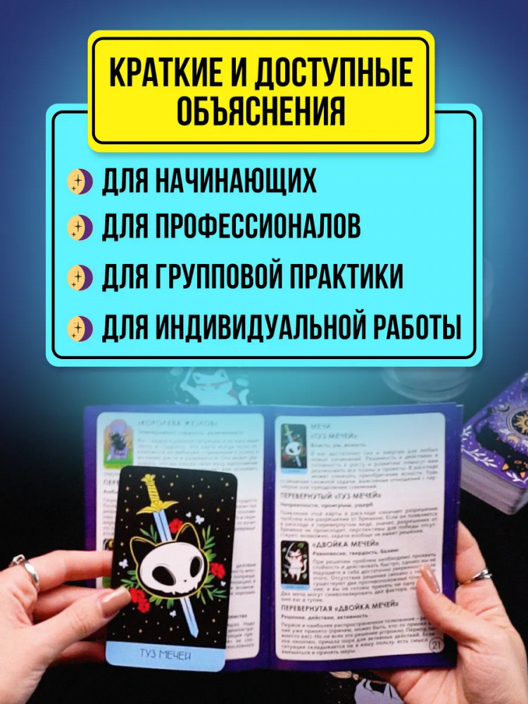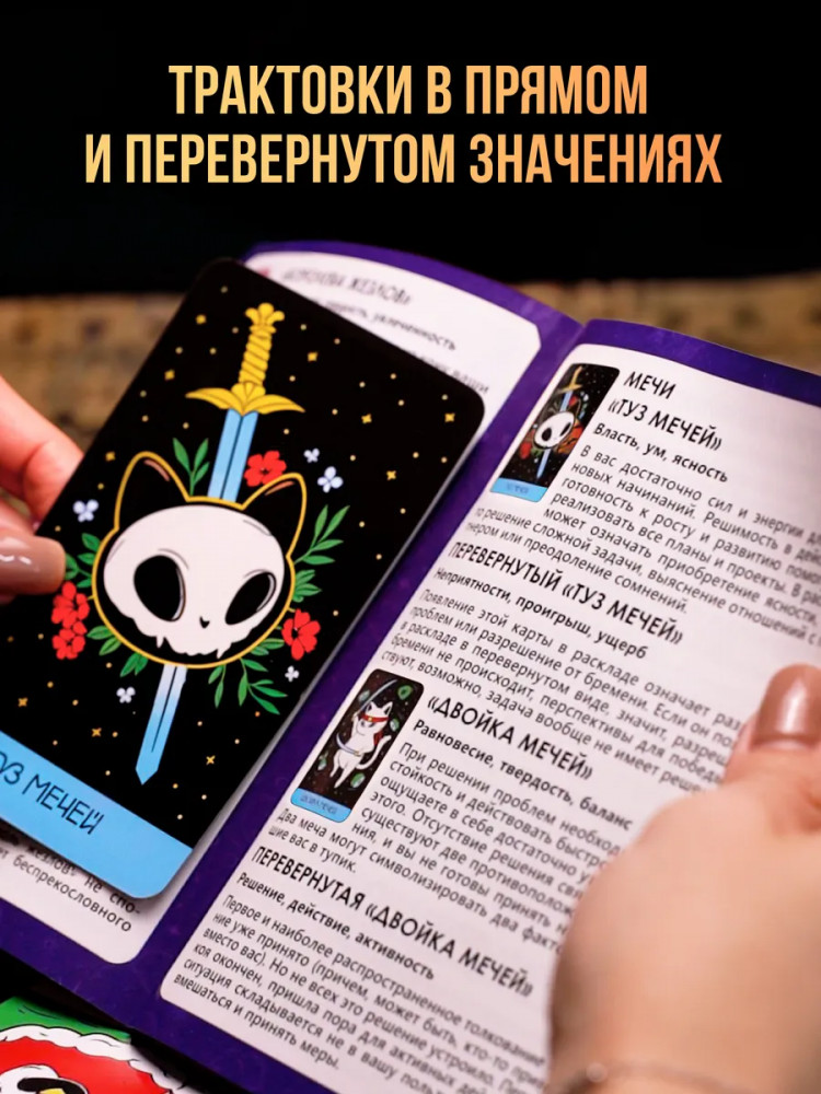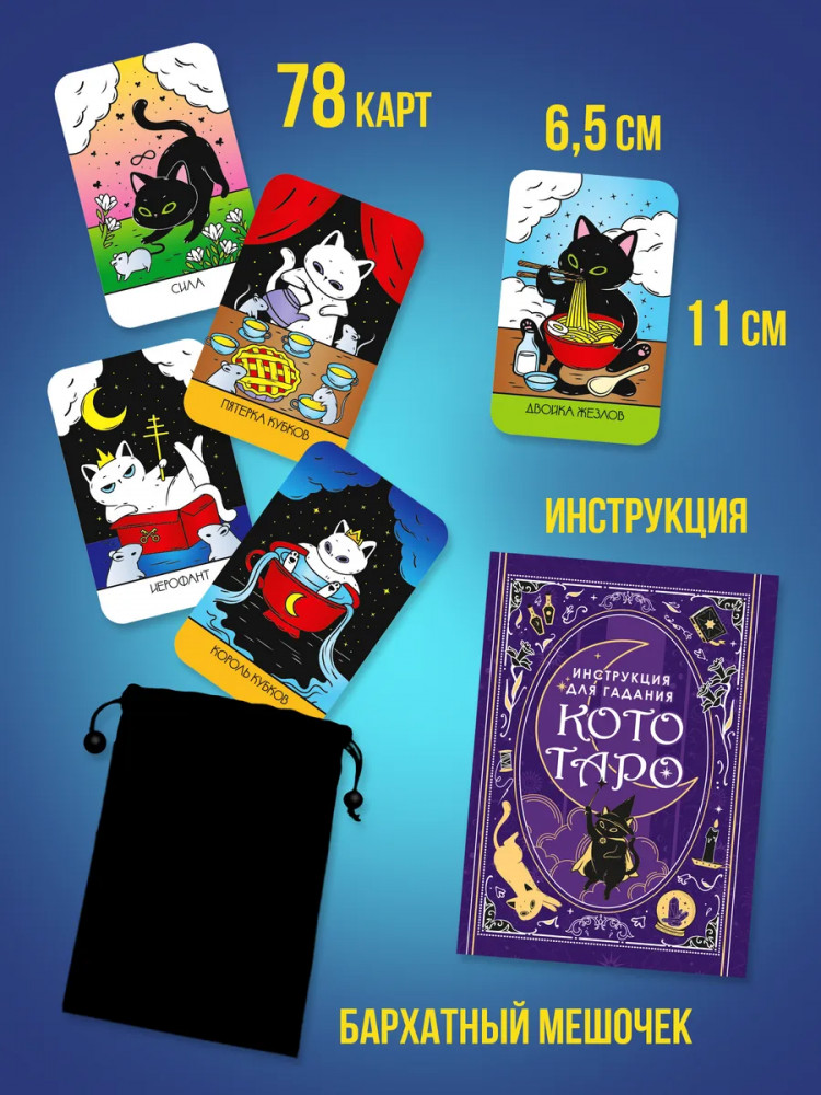 Origami Карты таро «Кото таро»В данный момент этот товар отсутствует в продаже. Возможно, у нас найдется аналогичный или похожий товар здесь. Добро пожаловать в мир гаданий! Карты таро с котами в стильном дизайне помогут найти ответы на волнующие вопросы, пробудить интуитивное восприятие и раскрыть творческий потенциал. Колода создана для гадательных практик. Инструкция содержит пояснения выпавших карт и 22 варианта раскладов на выбор. Каждая карта из этой колоды пронизана теплотой. Визуальные образы «милых котиков» добавляют особую атмосферу и способны вызвать положительные эмоции, что делает процесс гадания не только информативным, но и приятным. Карты Таро — это колода гадальных карт с трактовкой, объединяющая в себе магию и колдовство. Бархатный мешочек — отличный вариант для хранения карт. |