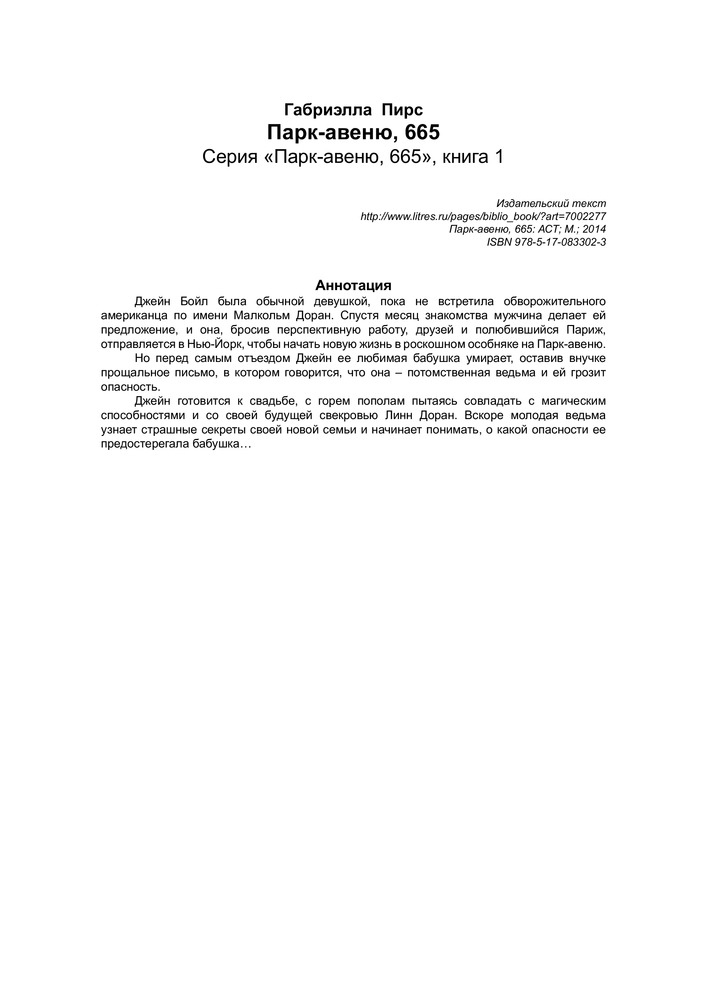 Парк-авеню, 665В данный момент этот товар отсутствует в продаже. Возможно, у нас найдется аналогичный или похожий товар здесь. Серия: Ангелы и демоны Джейн Бойл была обычной девушкой, пока не встретила обворожительного американца по имени Малкольм Доран. Спустя месяц знакомства мужчина делает ей предложение, и она, бросив перспективную работу, друзей и полюбившийся Париж, отправляется в Нью-Йорк, чтобы начать новую жизнь в роскошном особняке на Парк-авеню. Но перед самым отъездом Джейн ее любимая бабушка умирает, оставив внучке прощальное письмо, в котором говорится, что она – потомственная ведьма и ей грозит опасность. Джейн готовится к свадьбе, с горем пополам пытаясь совладать с магическим способностями и со своей будущей свекровью Линн Доран. Вскоре молодая ведьма узнает страшные секреты своей новой семьи и начинает понимать, о какой опасности ее предостерегала бабушка… |