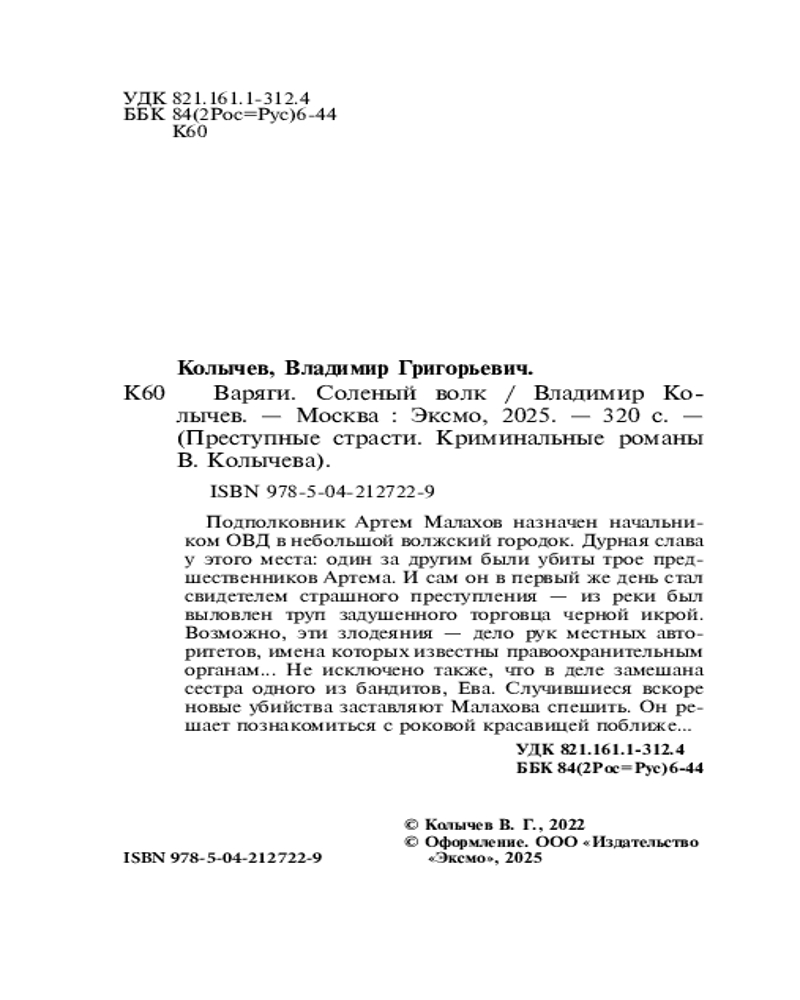 💳 Оплатить за товар можно при получении 🇰🇿 Есть бесплатная доставка по Казахстану 🎁 Копите бонусы с каждой покупки Серия: Преступные страсти. Криминальные романы В.Колычева Подполковник Артем Малахов назначен начальником ОВД в небольшой волжский городок. Дурная слава у этого места: один за другим были убиты трое предшественников Артема. И сам он в первый же день стал свидетелем страшного преступления — из реки был выловлен труп задушенного торговца черной икрой. Возможно, эти злодеяния — дело рук местных авторитетов, имена которых известны правоохранительным органам... Не исключено также, что в деле замешана сестра одного из бандитов, Ева. Случившиеся вскоре новые убийства заставляют Малахова спешить. Он решает познакомиться с роковой красавицей поближе... |