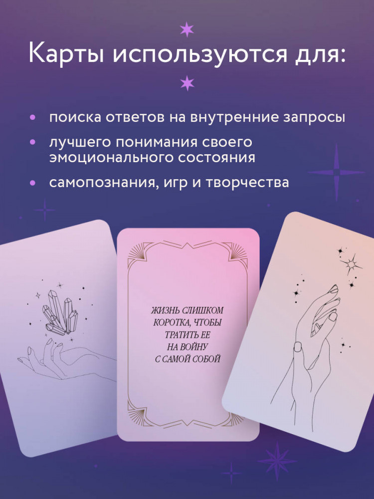 💳 Оплатить за товар можно при получении 🇰🇿 Есть бесплатная доставка по Казахстану от 1 дня 🎁 Копите бонусы с каждой покупки Серия: Внутренняя опора. Метафорические карты для обретения счастья Метафорические карты «С заботой о себе» — это глубинные послания космоса, которые помогут оставаться «здесь и сейчас», заглянуть внутрь себя и найти ответы на важные личные вопросы. Они разработаны для поиска ответа на внутренние запросы, изучения своего психологического и эмоционального состояния, используются для самопознания, игр и творчества. Колода поможет вам услышать подсказки Вселенной, успокоить ум и пробудить истинные желания — для этого достаточно позволить Вселенной вести вас и просто вытянуть карту. Первая ассоциация, которая придет вам в голову при взгляде на карту, — и есть правильный ответ. Карты созданы для того, чтобы поддерживать вас на пути к бережности и заботе о себе, постепенно восполнять ресурс вашей энергии и сохранять его на высоком уровне. |