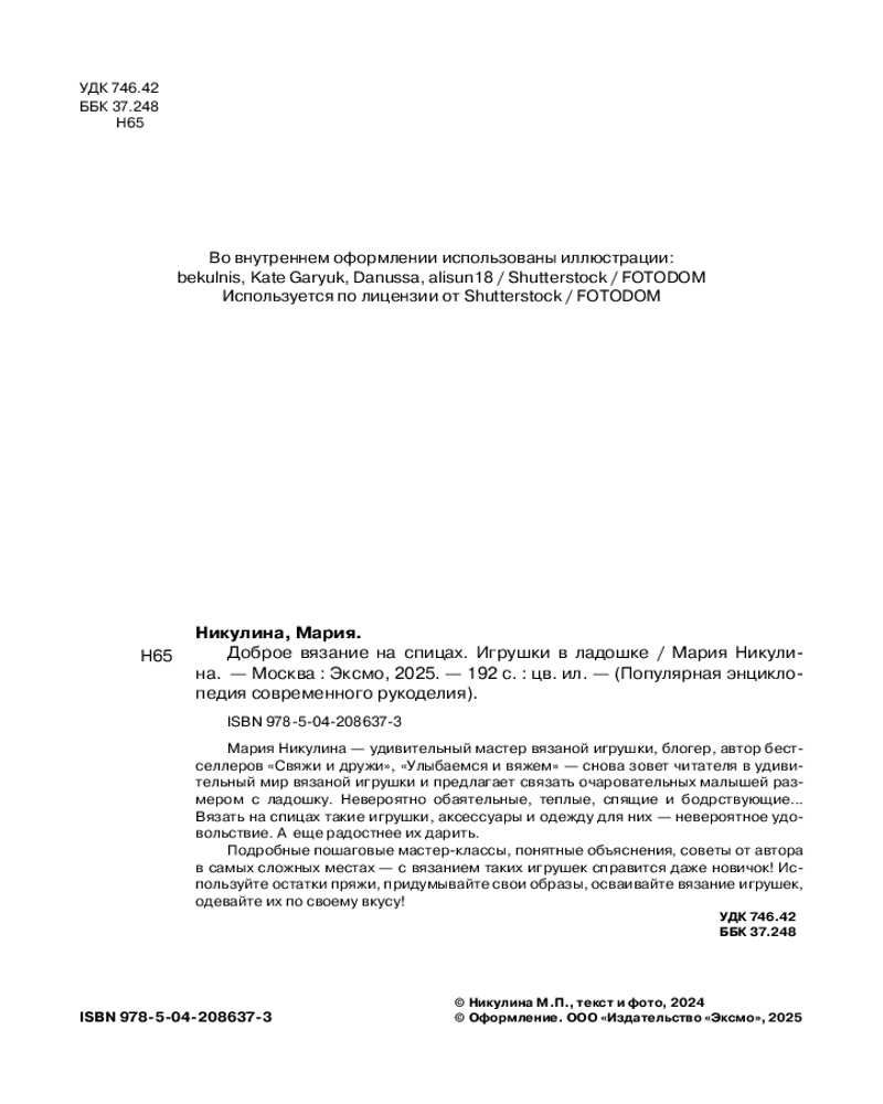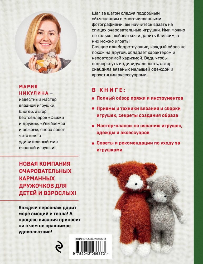 💳 Оплатить за товар можно при получении 🇰🇿 Есть бесплатная доставка по Казахстану от 1 дня 🎁 Копите бонусы с каждой покупки Серия: Популярная энциклопедия современного рукоделия Новая компания очаровательных карманных дружочков, связанных на спицах, от автора бестселлеров «Свяжи и дружи» и «Улыбаемся и вяжем» Марии Никулиной! Шаг за шагом, следуя подробным объяснениям с многочисленными фотографиями, вы научитесь вязать на спицах очаровательные игрушки, вызывающие восторг, умиление и огромный интерес у окружающих. Ими можно не только любоваться и дарить близким, в них можно играть! Спящие или бодрствующие, каждый образ не похож на другой, каждый персонаж обладает собственным характером и неповторимой харизмой. И даже немного похож на кого-то из ваших знакомых. Ведь чтобы подчеркнуть индивидуальность, автор снабдила вязаных малышей одеждой и крохотными аксессуарами! Каждый персонаж невероятно трогателен и дарит море эмоций и тепла! А процесс вязания таких малышей приносит ни с чем не сравнимое удовольствие! |