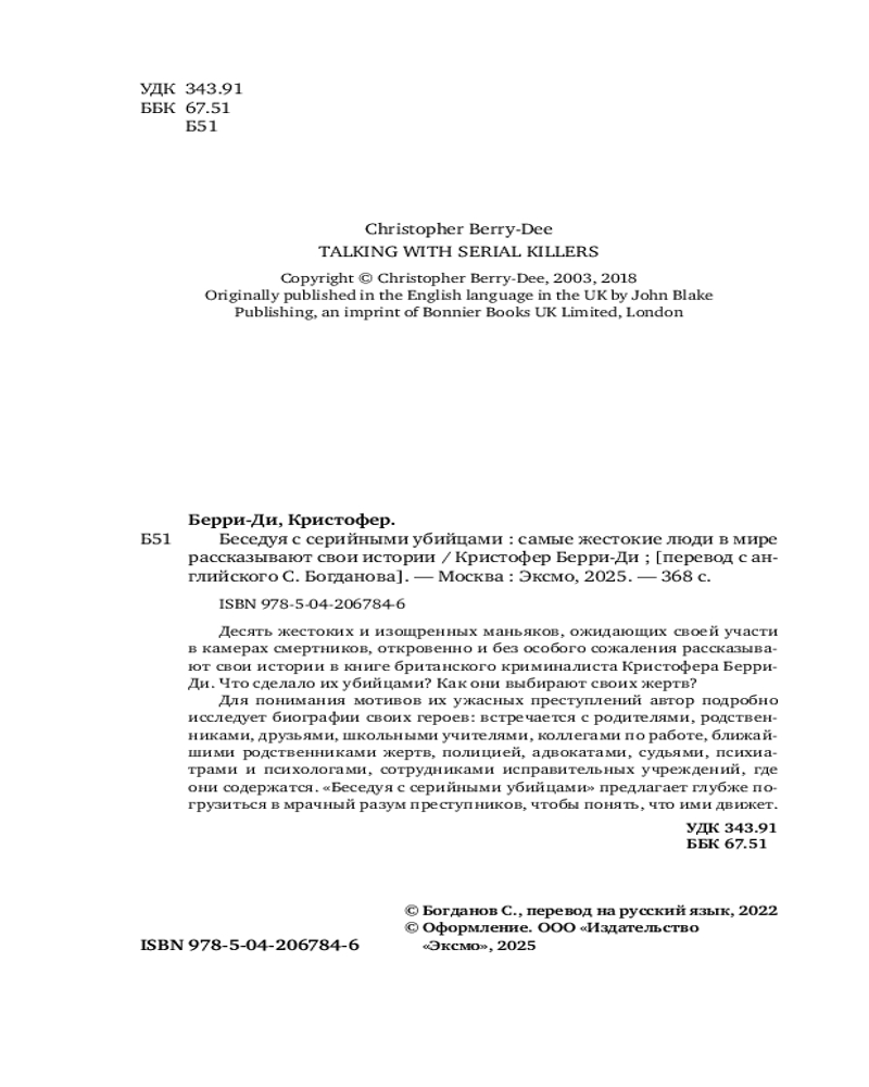 💳 Оплатить за товар можно при получении 🇰🇿 Есть бесплатная доставка по Казахстану от 1 дня 🎁 Копите бонусы с каждой покупки Серия: Profiling. Искусство вычислять преступников Кристофер Берри-Ди — британский криминалист и писатель, автор бестселлеров о серийных маньяках и психопатах. Ожидая своей участи в камере смертников, они заговорили... Всемирно известный криминалист-расследователь побывал в тюрьмах строгого режима и взял интервью у самых опасных и жестоких убийц. Эти интервью легли в основу книги, которая с момента ее первой публикации в 2002 году стала настоящей классикой литературы true-crime, выдержав множество переизданий. |
