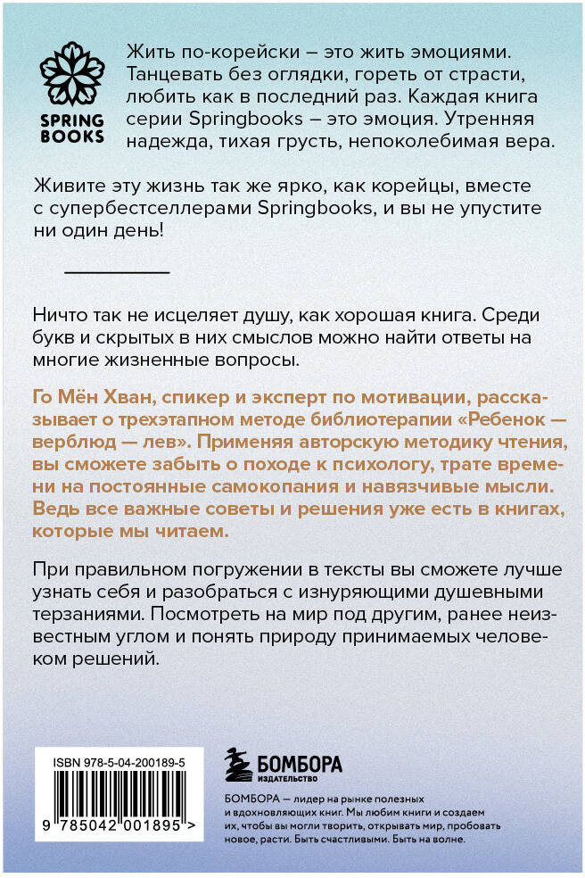 💳 Оплатить за товар можно при получении 🇰🇿 Есть бесплатная доставка по Казахстану от 1 дня 🎁 Копите бонусы с каждой покупки Серия: Springbooks. Корейские бестселлеры Ничто так не исцеляет душу, как хорошая книга. Среди букв и скрытых в них смыслов можно найти ответы на многие жизненные вопросы. Го Мен Хван, спикер и эксперт по мотивации, рассказывает о трехэтапном методе библиотерапии «ребенок-верблюд-лев». Применяя авторскую методику чтения, вы сможете забыть о походе к психологу, трате времени на постоянные самокопания и навязчивые мысли. Ведь все важные советы и решения уже есть в книгах, которые мы читаем. При правильном погружении в тексты вы сможете лучше узнать себя и разобраться с изнуряющими душевными терзаниями. Посмотреть на мир под другим, ранее неизвестным, углом и понять природу принимаемых человеком решений. |