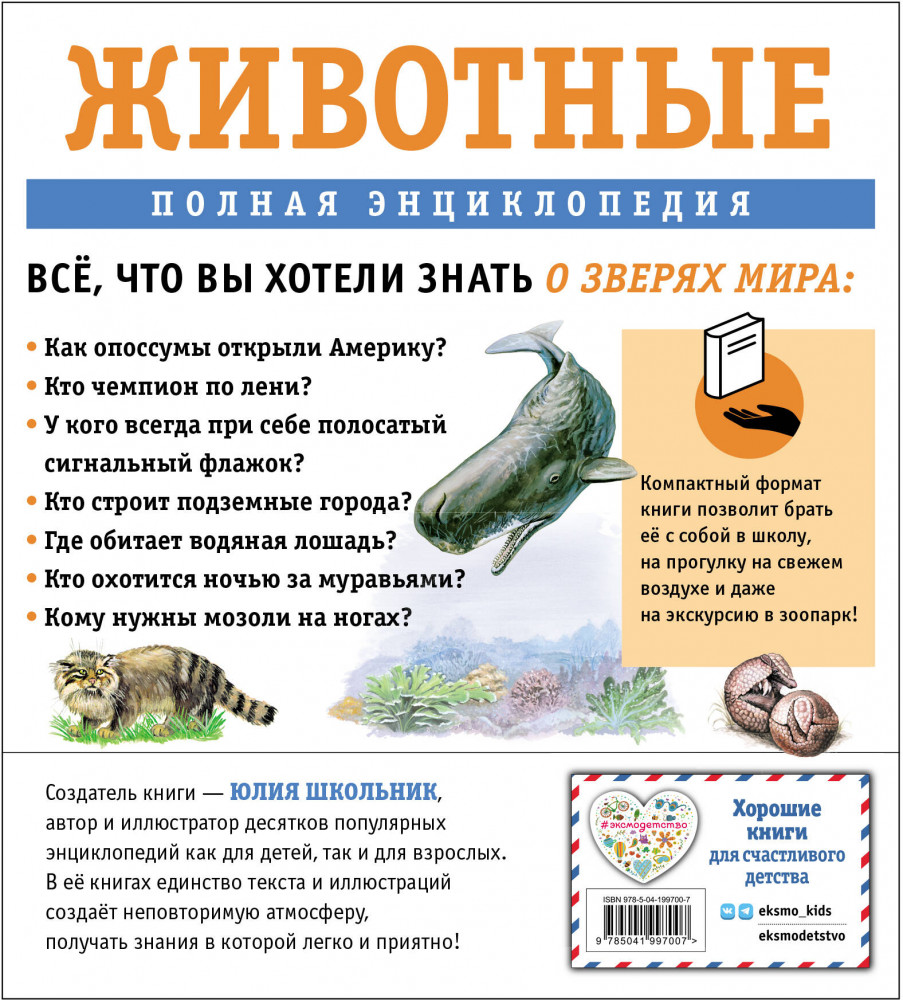 Серия: Атласы и энциклопедии. Полные энциклопедии (мини) В этой полной энциклопедии — новейшая научная классификация царства животных! Самые увлекательные и полезные факты об обитателях разных уголков света, особенности поведения и физиологии разных млекопитающих, занимательные и подробные характеристики разных семейств и мест их обитаний, секреты ближайших родственников человека — и всё это в одной книге. Информация в энциклопедии подана захватывающе и разнообразно, сопровождается большим количеством иллюстративного материала, поэтому привлечёт интерес как любого подростка, так и взрослого человека. Автор и иллюстратор книги — Юлия Школьник, создавшая множество популярных детских энциклопедий. |