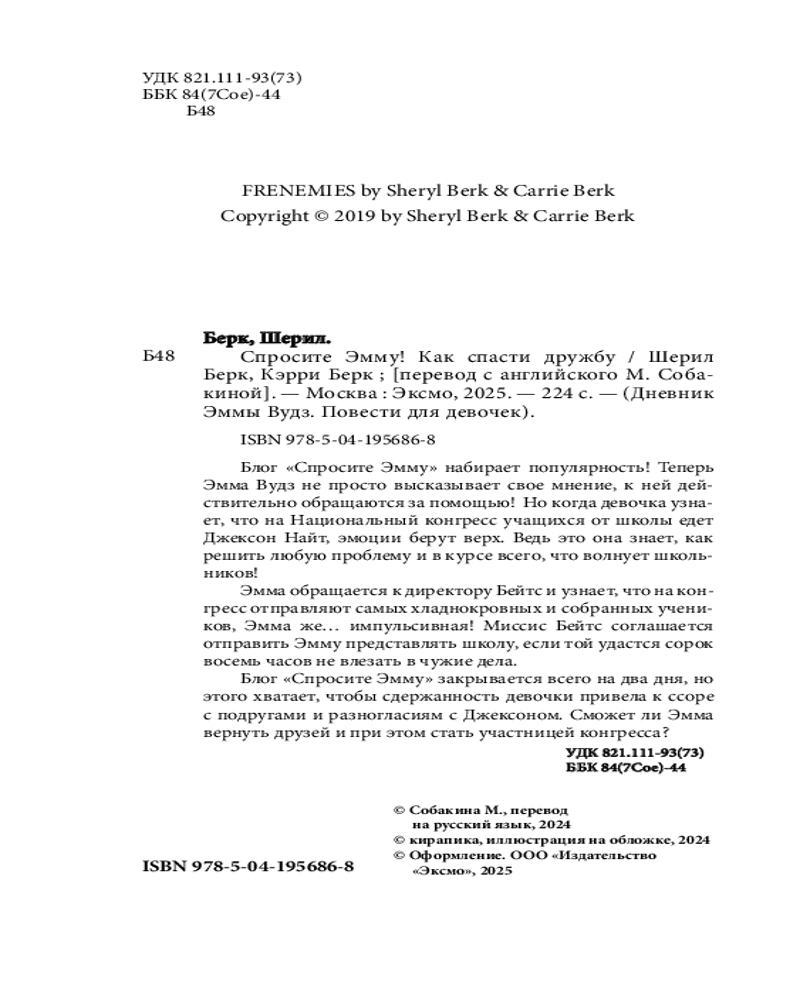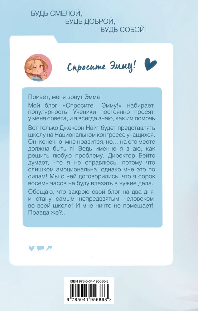 💳 Оплатить за товар можно при получении 🇰🇿 Есть бесплатная доставка по Казахстану от 1 дня 🎁 Копите бонусы с каждой покупки Серия: Дневник Эммы Вудз. Повести для девочек Блог «Спросите Эмму» набирает популярность! Теперь Эмма Вудз не просто высказывает свое мнение, к ней действительно обращаются за помощью! Но когда девочка узнает, что на Национальный конгресс учащихся от школы едет Джексон Найт, эмоции берут верх. Ведь это она знает, как решить любую проблему и в курсе всего, что волнует школьников! Эмма обращается к директору Бейтс и узнает, что на конгресс отправляют самых хладнокровных и собранных учеников, Эмма же... импульсивная! Миссис Бейтс соглашается отправить Эмму представлять школу, если той удастся сорок восемь часов не влезать в чужие дела. Блог «Спросите Эмму» закрывается всего на два дня, но этого хватает, чтобы сдержанность девочки привела к ссоре с подругами и разногласиям с Джексоном. Сможет ли Эмма вернуть друзей и при этом стать участницей конгресса? |