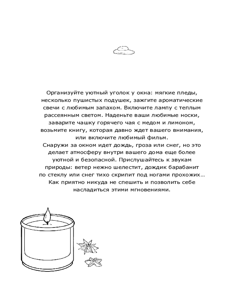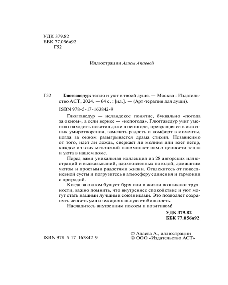 💳 Оплатить за товар можно при получении 🇰🇿 Есть бесплатная доставка по Казахстану от 1 дня 🎁 Копите бонусы с каждой покупки Серия: Арт-терапия для души Глюггаведур — исландское понятие, буквально «погода за окном», а если вернее — «непогода». Глюггаведур учит умению находить позитив даже в непогоде, превращая ее в источник умиротворения, замечать радость и комфорт в моменты, когда за окном разыгрывается драма стихий. Независимо от того, идет ли дождь, сверкает ли молния или воет ветер, каждое из этих мгновений напоминает нам о ценности тепла и уюта в нашем доме. Перед вами уникальная коллекция из 28 авторских иллюстраций и высказываний, вдохновленных погодой, домашним уютом и простыми радостями жизни. Отвлекитесь от повседневной суеты и погрузитесь в атмосферу единения и гармонии с природой. Когда за окном бушует буря или в жизни возникают трудности, важно помнить, что внутреннее спокойствие и уют могут стать нашими лучшими союзниками. Это позволяет сохранять ясность ума и эмоциональную стабильность. Насладитесь внутренним покоем и позитивом! |