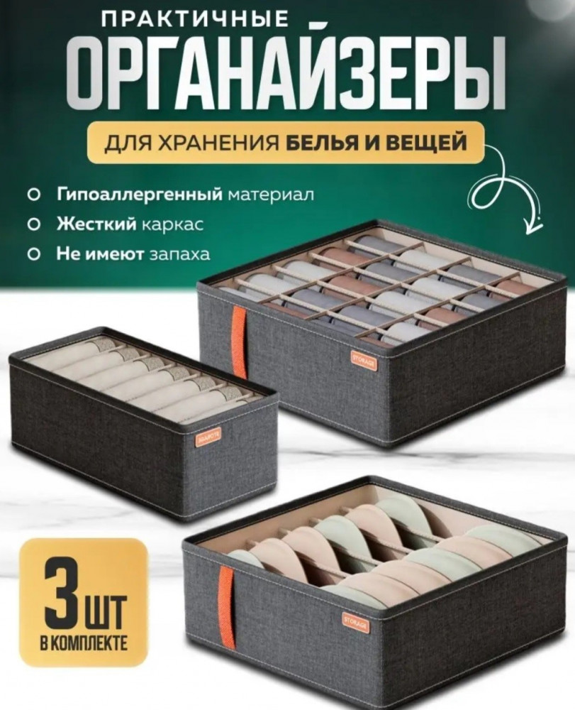Универсальный складной органайзер для хранения вещей премиального качества, поможет навести порядок у вас дома и организовать пространство в гардеробной, в шкафу или в комоде! Набор состоит из 3-х штук.