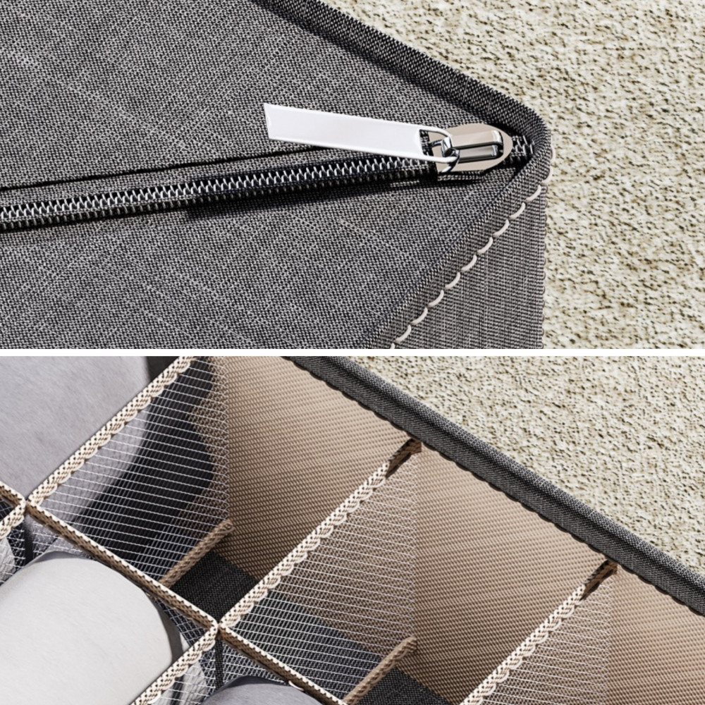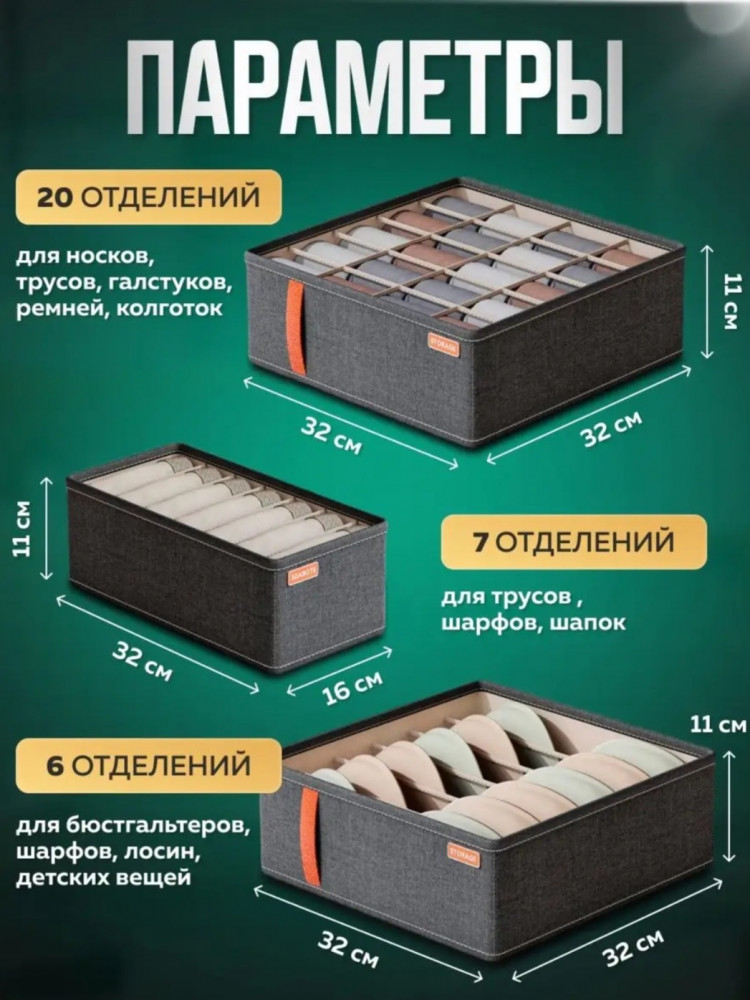 ►Премиум сапалы заттарды сақтауға арналған әмбебап жиналмалы ұйымдастырушы сіздің үйіңізді ретке келтіруге және киім-кешек бөлмесінде, шкафта немесе шкафта орын ұйымдастыруға көмектеседі! Жинақ 3 данадан тұрады. Ұйымдастырушылар-ұсақ-түйектерді, іш киімдерді, көкірекшелерді, шұлықтарды, галстуктарды, колготкаларды сақтауға арналған бөлінген, дем алатын қалталары бар коферлер. Ұйымдастырушылар қою сұр түсте ұсынылған, интерьерде бір-бірін эстетикалық жағынан толықтырады. Берік және тығыз материалдан жасалған - тозуға төзімділігі, беріктігі және су өткізбейтін оксфорд.