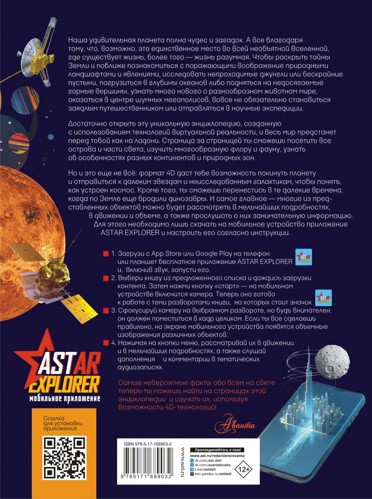 💳 Оплатить за товар можно при получении 🇰🇿 Есть бесплатная доставка по Казахстану 🎁 Копите бонусы с каждой покупки Серия: Гигантская детская энциклопедия с дополненной реальностью Наш дом — планета Земля, несущаяся в космосе с невообразимой скоростью, — огромен и многообразен. Изучая и познавая свой уютный мир и всё, что его окружает, человечество прошло долгий путь в своем развитии, но тем не менее мы еще многого не знаем — Вселенная до сих пор хранит множество тайн, раскрыть которые нам еще предстоит. Тематический охват этой уникальной энциклопедии с дополненной реальностью поистине безграничен, ведь на ее страницах рассказывается буквально обо всем на свете! Здесь описываются материки, моря и океаны нашей планеты, горы и пещеры, реки и водопады, жаркие и ледяные пустыни, джунгли и степи, различные природные и климатические явления, богатый животный мир — древний и современный. Пристальное внимание уделяется и всему тому, что непосредственно связано с деятельностью человека: издание дает возможность побывать в разных странах и крупнейших городах мира, познакомиться с их природными, культурными и архитектурными достопримечательностями. Наконец, книга позволяет выйти за пределы атмосферы и отправиться в космос, чтобы попытаться понять, как устроена бескрайняя Вселенная. |