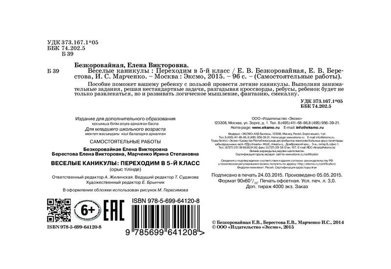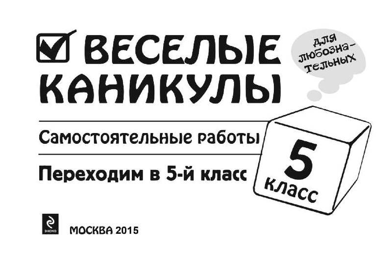 Веселые каникулы. Переходим в 5-й классИрина Степановна Марченко, Елена Викторовна Безкоровайная, Елена Владимировна Берестова В данный момент этот товар отсутствует в продаже. Возможно, у нас найдется аналогичный или похожий товар здесь. Серия: Самостоятельные работы Пособие поможет вашему ребенку с пользой провести летние каникулы. Выполняя занимательные задания, решая нестандартные задачи, разгадывая кроссворды, ребусы, ребенок будет не только развлекаться, но и развивать логическое мышление, фантазию, смекалку, научится наблюдать и самостоятельно работать. |