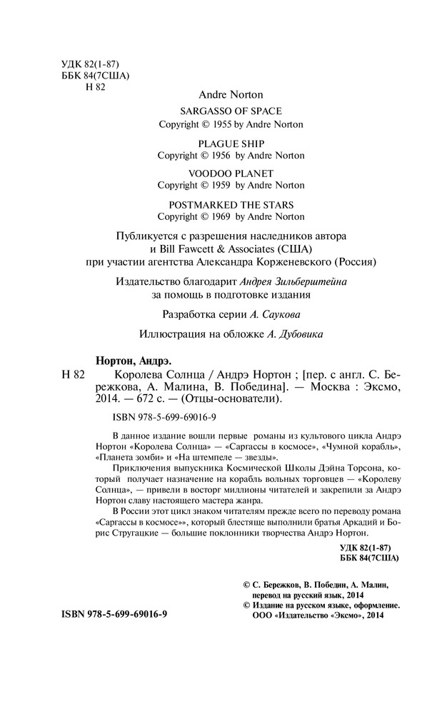 Королева СолнцаВ данный момент этот товар отсутствует в продаже. Возможно, у нас найдется аналогичный или похожий товар здесь. Серия: Отцы — основатели В данное издание вошли первые романы из культового цикла Андрэ Нортон "Королева Солнца"- "Саргассы в космосе", "Чумной корабль", "Планета зомби" и "На штемпеле - звезды". |
