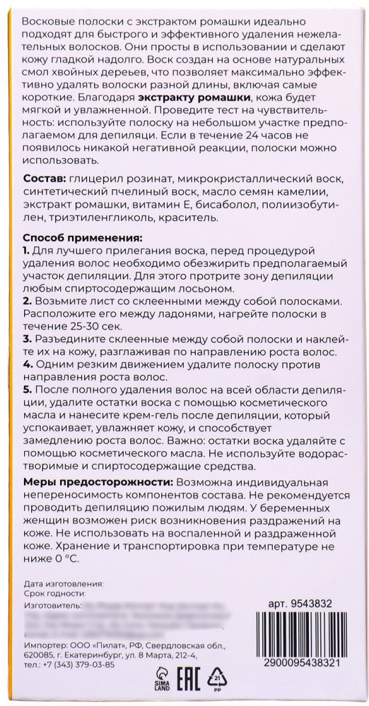 💳 Оплатить за товар можно при получении 🇰🇿 Есть бесплатная доставка по Казахстану от 1 дня 🎁 Копите бонусы с каждой покупки Восковые полоски с экстрактом ромашки идеально подходят для быстрого и эффективного удаления нежелательных волосков на любом участке тела. Они просты в использовании и сделают кожу гладкой надолго. Воск создан на основе натуральных смол хвойных дереьев, что позволяет максимально эффективно удалять волоски разной длины, включая самые короткие. Благодаря экстракту ромашки и витамина Е, кожа будет мягкой и увлажненной. Проведите тест на чувствительность: используйте полоску на небольшом участке предполагаемом для депиляци. Если в течение 24 часов не появилось никакой негативной реакции, полоски можно использовать. |