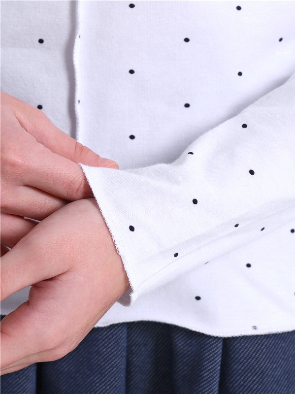 Лонгслив для девочки выполнен из мягкого хлопкового полотна с лайкрой. Изделие прилегающего силуэта с цельнокроеным воротником-стойкой и удлиненными рукавами. По центру полочки декоративный шов, Открытые срезы по рукавам, горловине и низу изделия обработаны оверлоком.